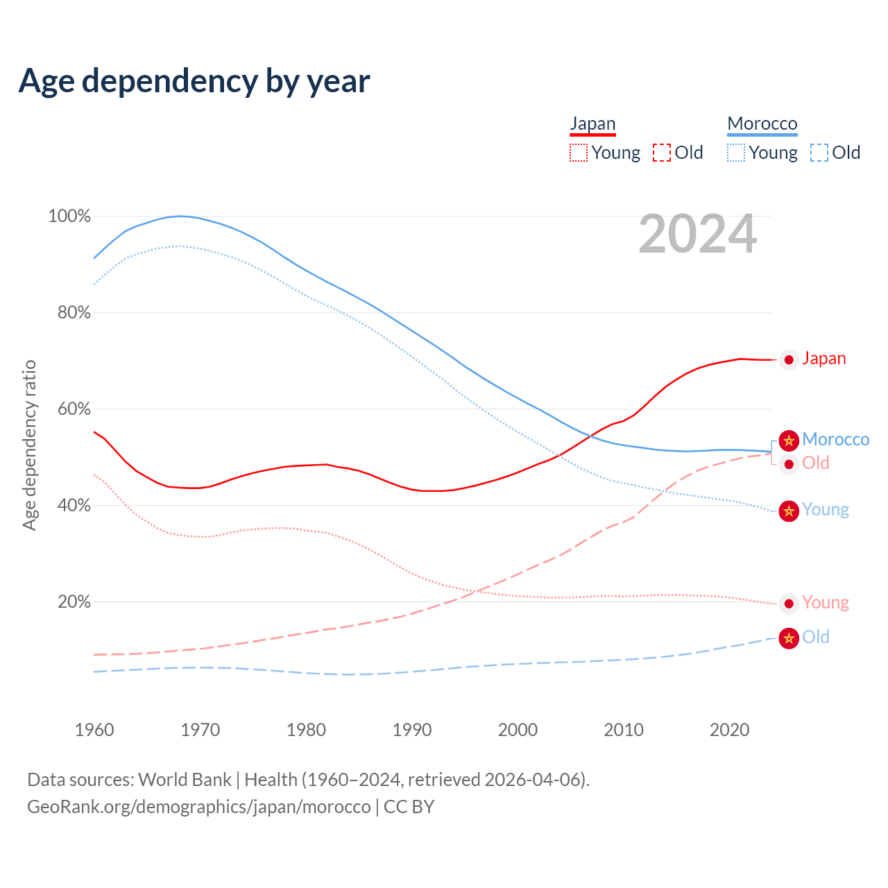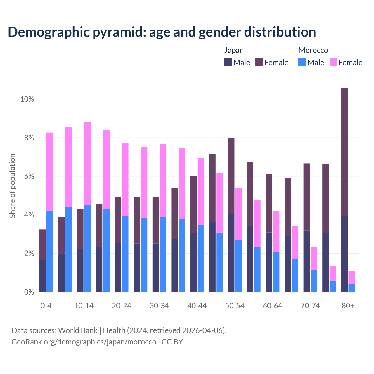 - Japan is ranked 2/196 by median age (oldest to youngest) vs 100/196 for Morocco.