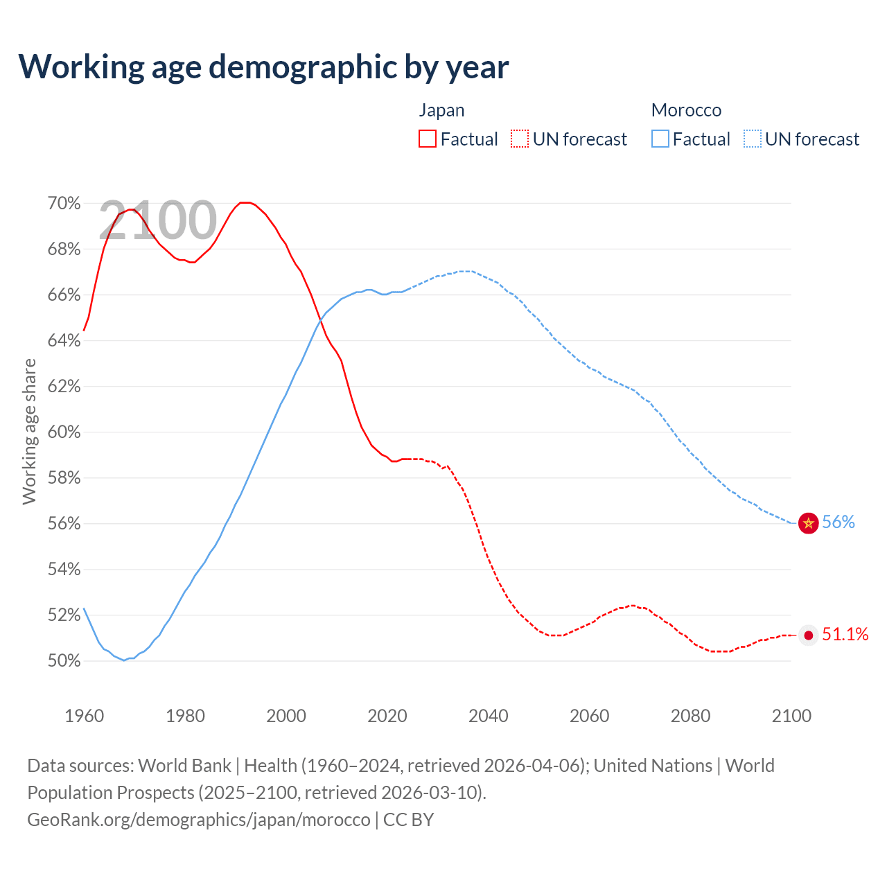 - Japan has 72.1M working age adults (aged 15-64) vs 25.7M in Morocco.