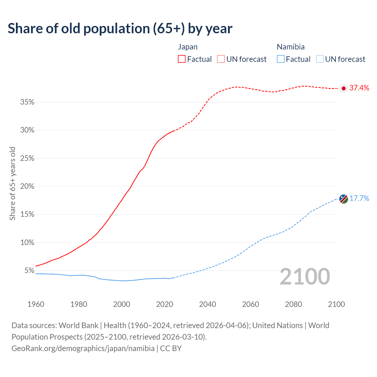 The share of older people aged 65 and over is 29.8% in Japan and 3.67% in Namibia. Life expectancy in Japan compared to Namibia .