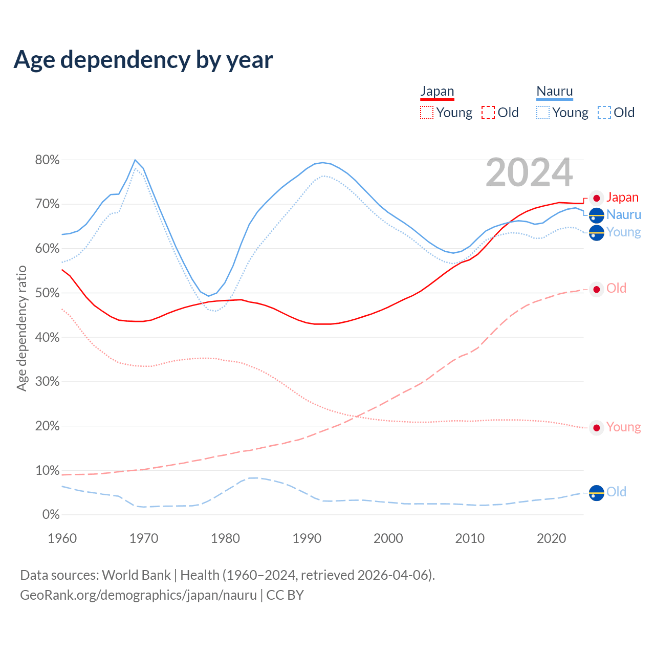 - Japan is ranked 2/196 by median age (oldest to youngest) vs 155/196 for Nauru.