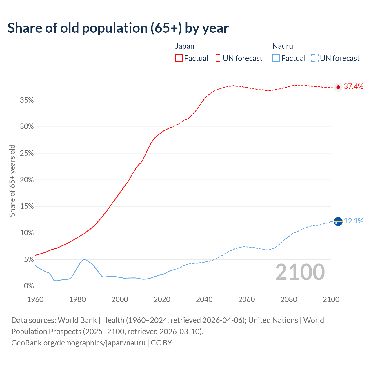 The share of older people aged 65 and over is 29.8% in Japan and 2.85% in Nauru. Life expectancy in Japan compared to Nauru .
