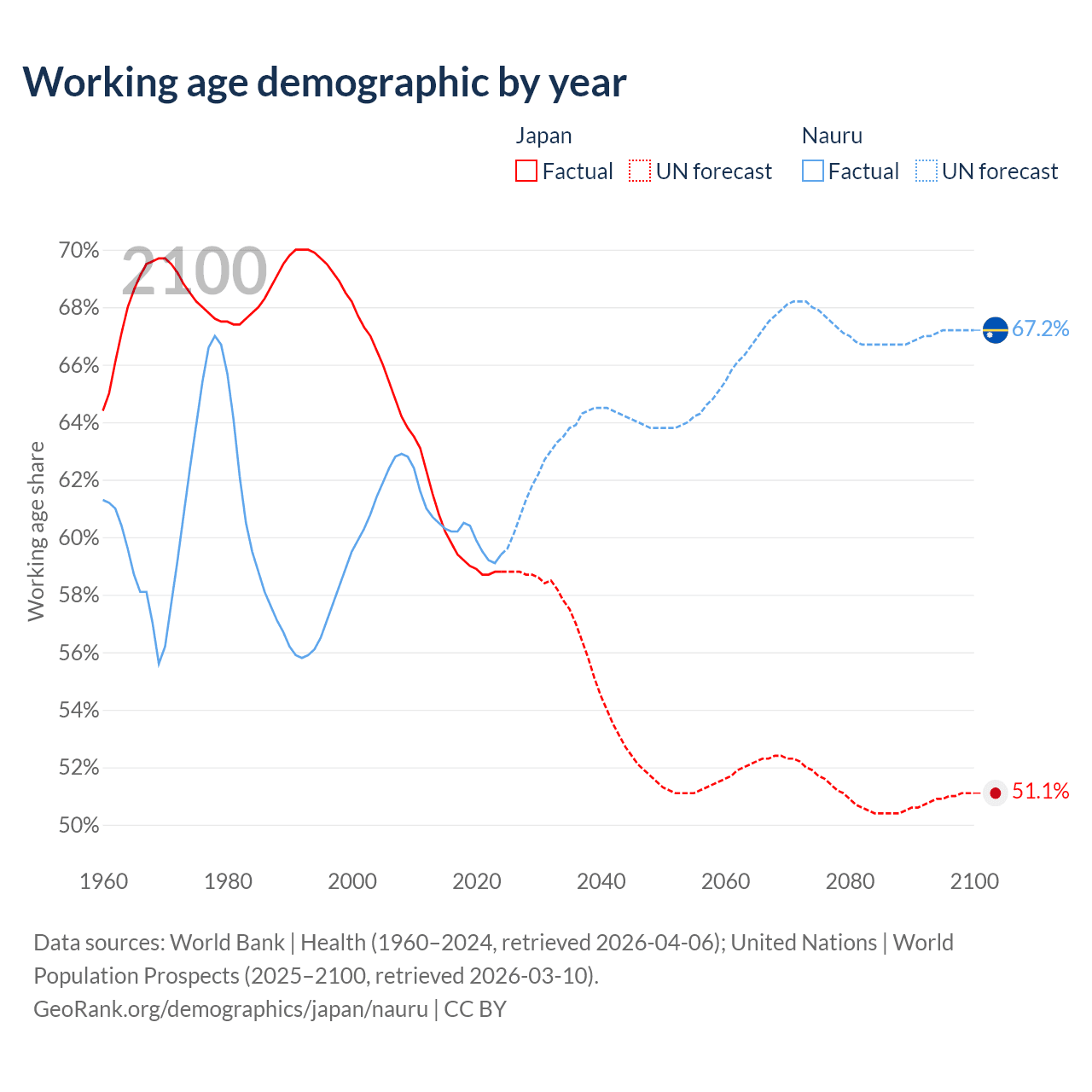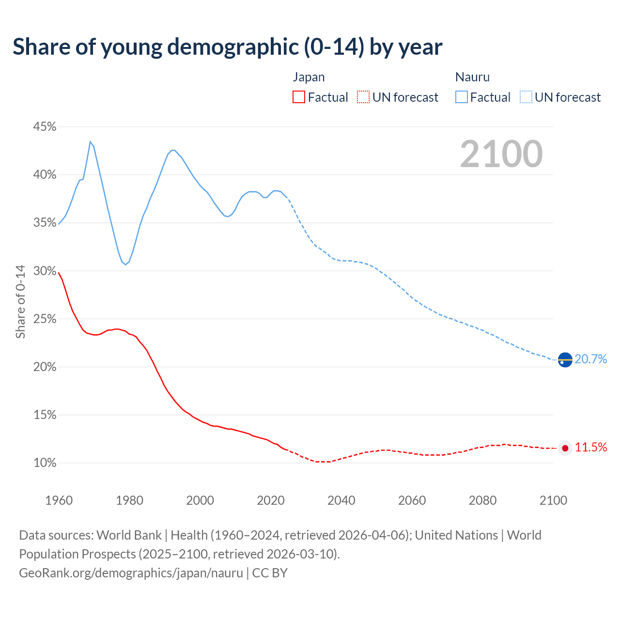 Median age Japan vs Nauru, 1960-2100