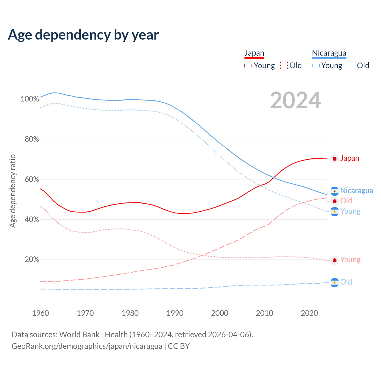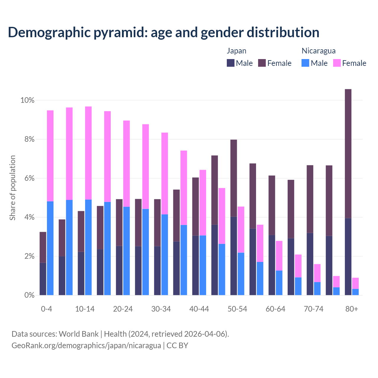- Japan is ranked 2/196 by median age (oldest to youngest) vs 125/196 for Nicaragua.