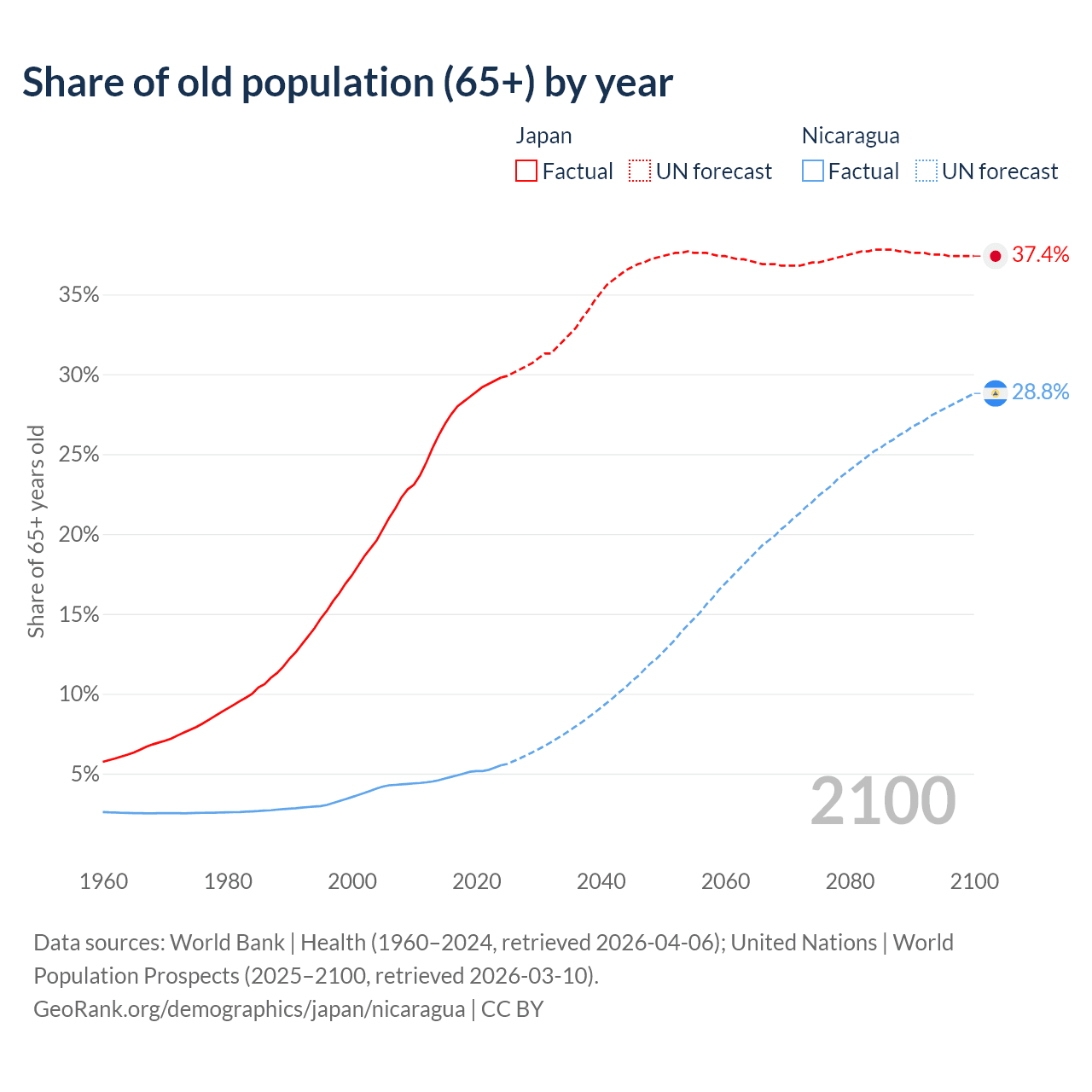 The share of older people aged 65 and over is 29.8% in Japan and 5.53% in Nicaragua. Life expectancy in Japan compared to Nicaragua .