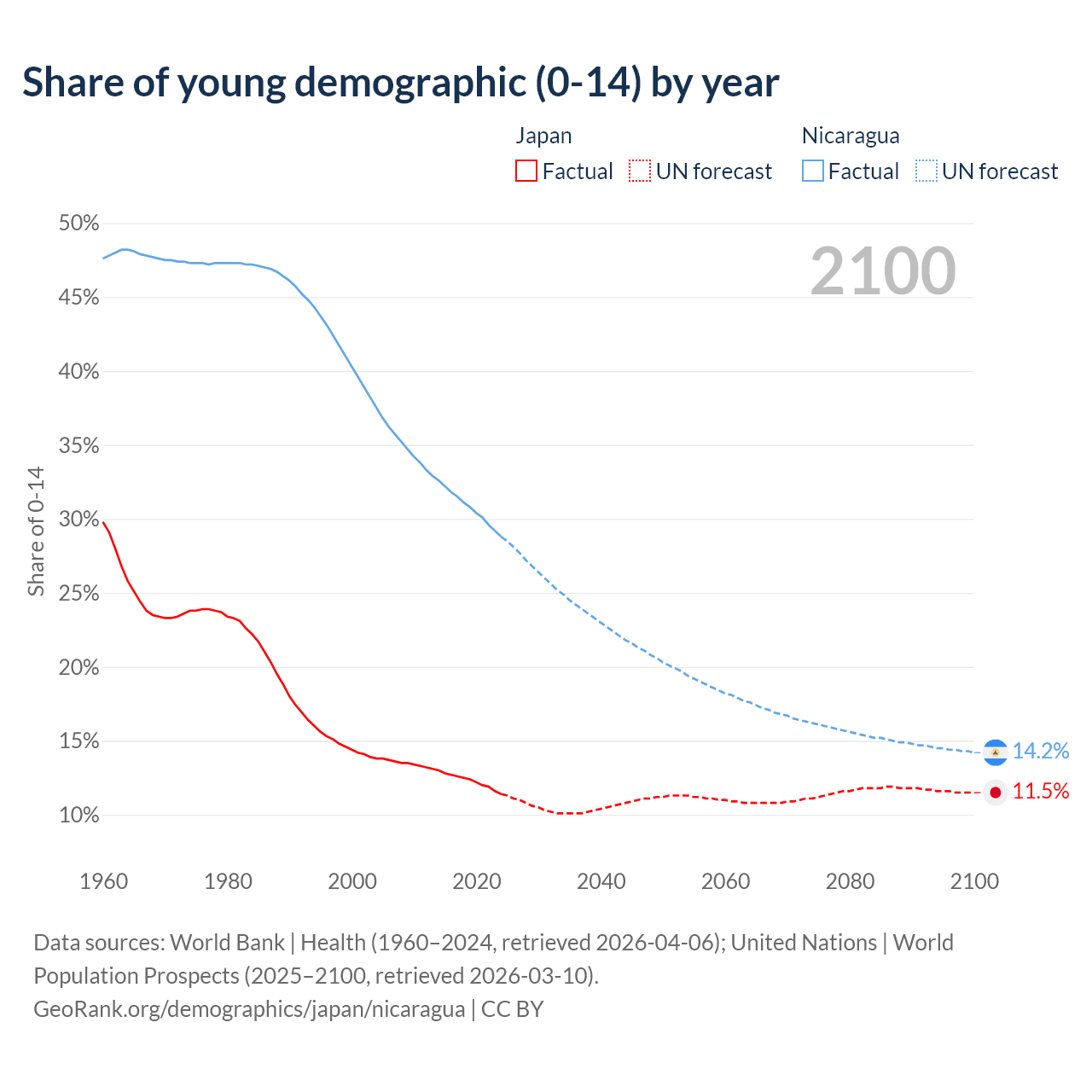 - The share of young demographic (0-15 years old) in Japan is 11.4% vs 28.8% in Nicaragua.