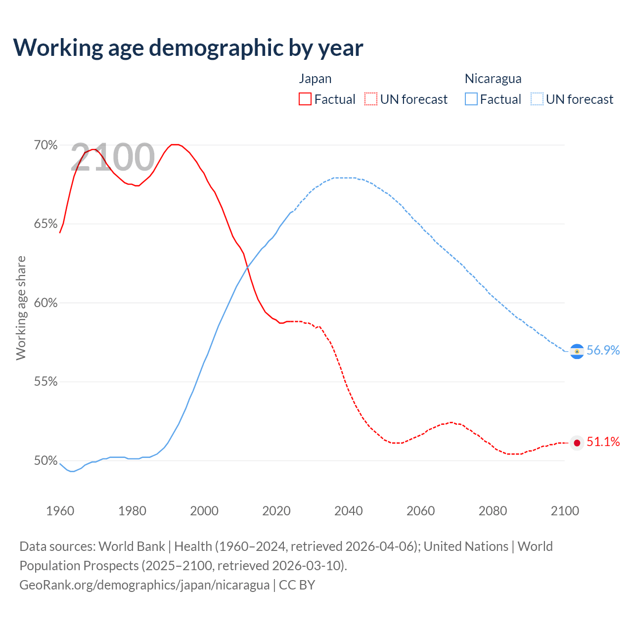 - Japan has 72.1M working age adults (aged 15-64) vs 4.68M in Nicaragua.