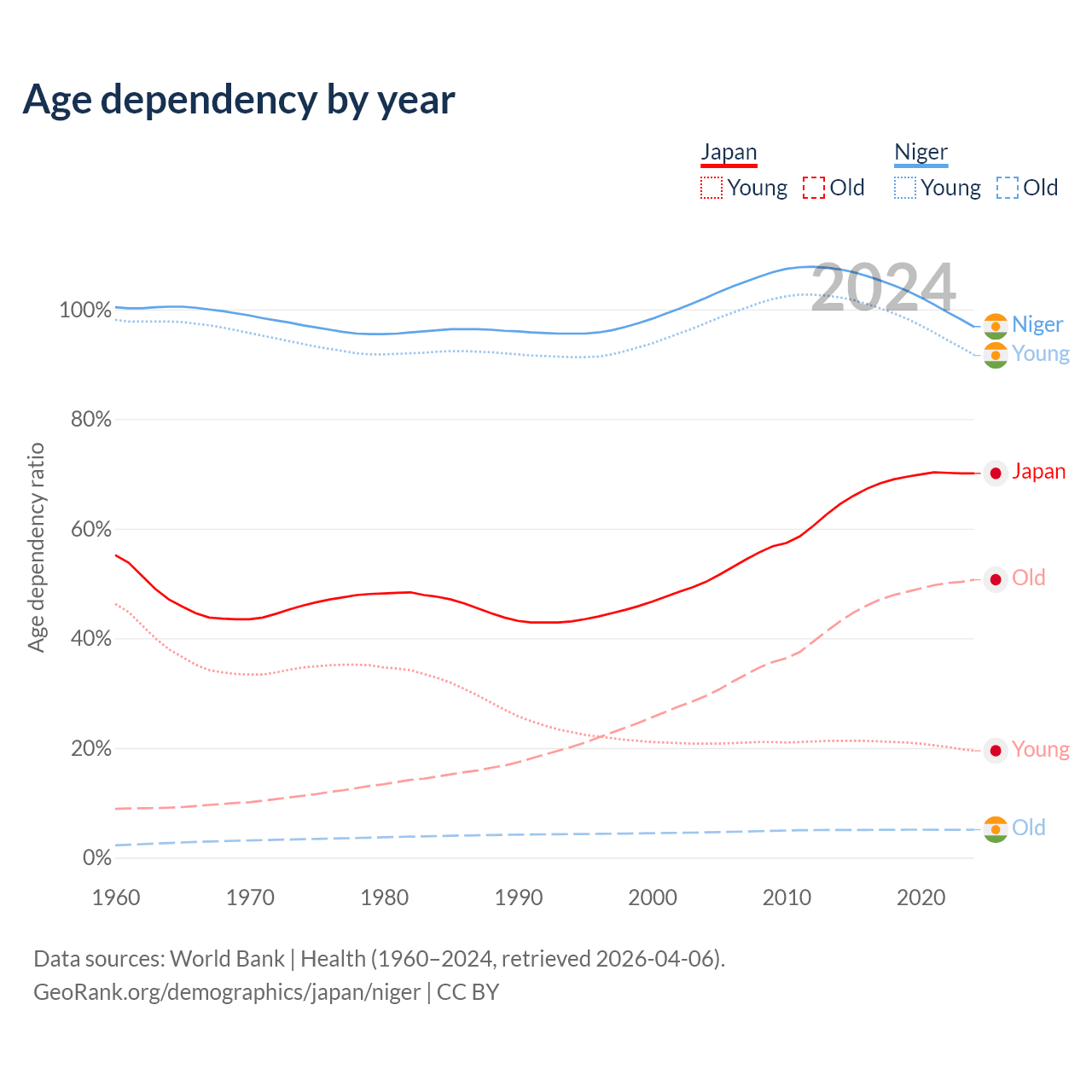 - Japan is ranked 2/196 by median age (oldest to youngest) vs 195/196 for Niger.