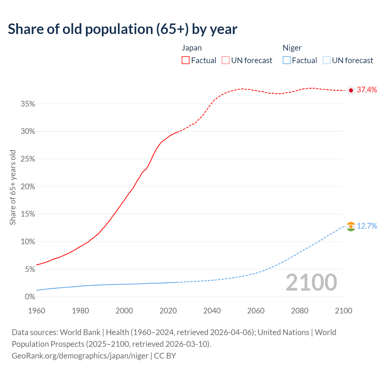The share of older people aged 65 and over is 29.8% in Japan and 2.59% in Niger. Life expectancy in Japan compared to Niger .