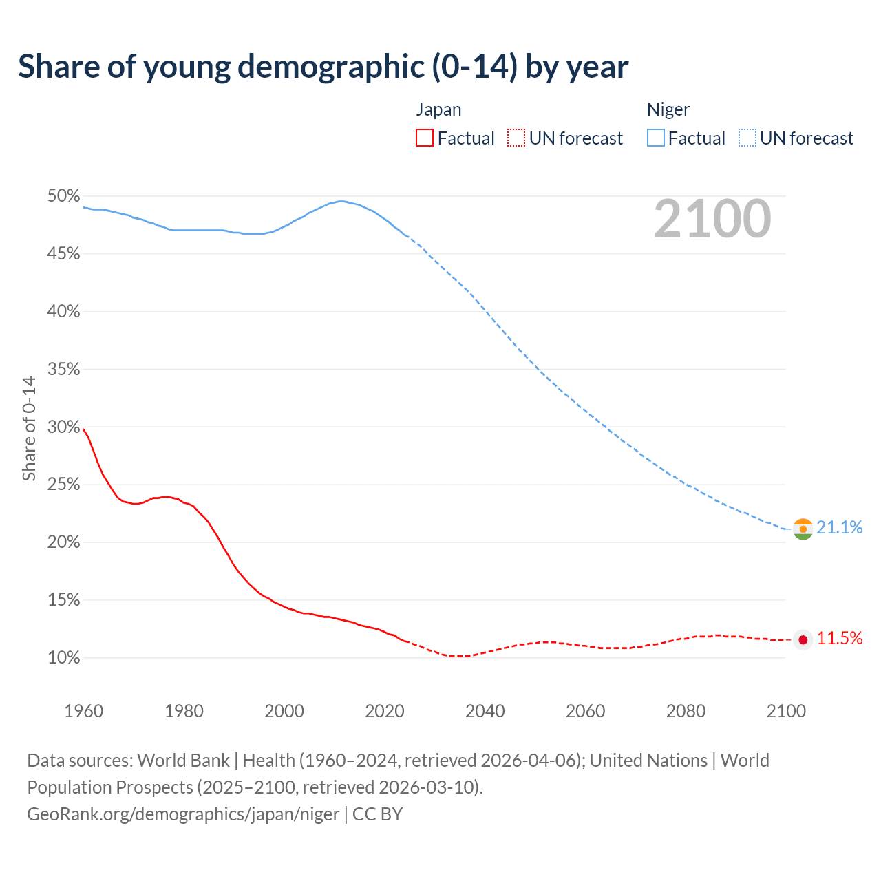 - The share of young demographic (0-15 years old) in Japan is 11.4% vs 46.6% in Niger.
