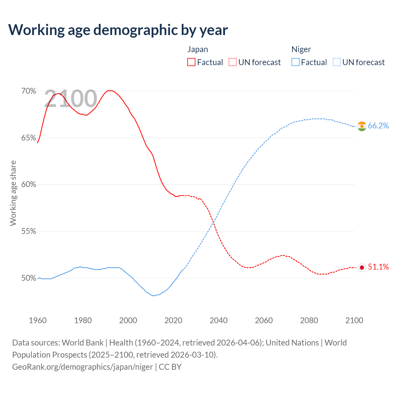 - Japan has 72.1M working age adults (aged 15-64) vs 14.8M in Niger.