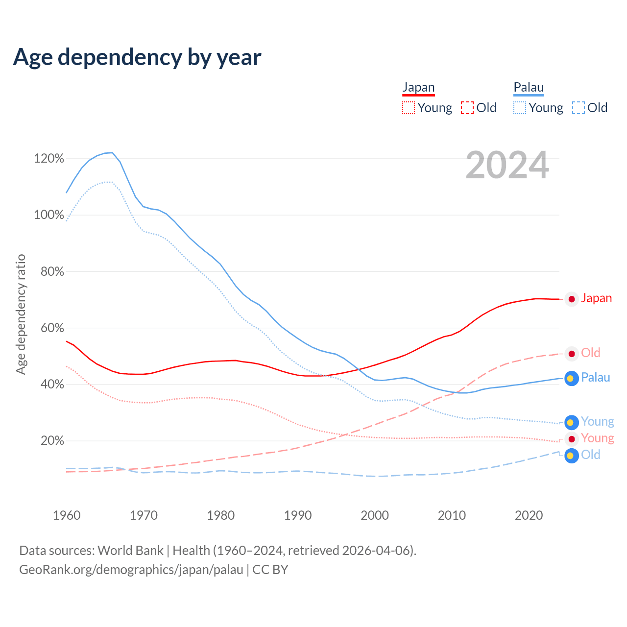 - Japan is ranked 2/196 by median age (oldest to youngest) vs 53/196 for Palau.