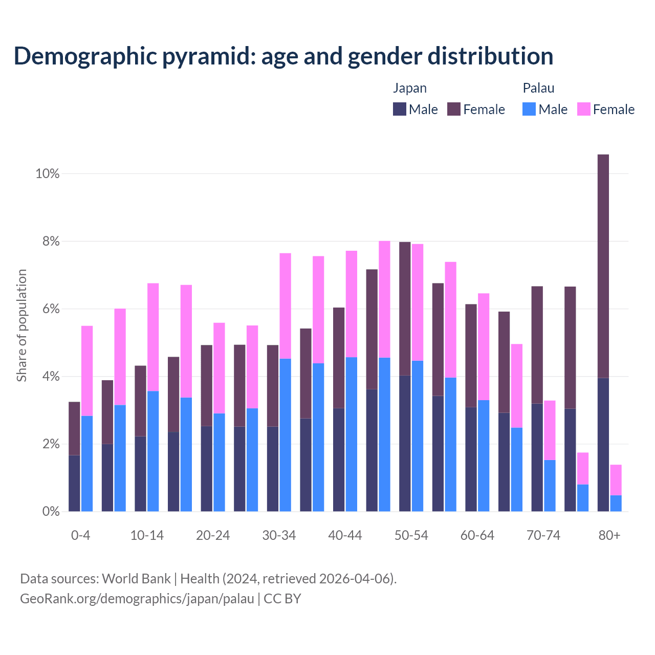 - As of 2026, the population of Japan is 123M vs 17.6K in Palau - 6,959 times difference.