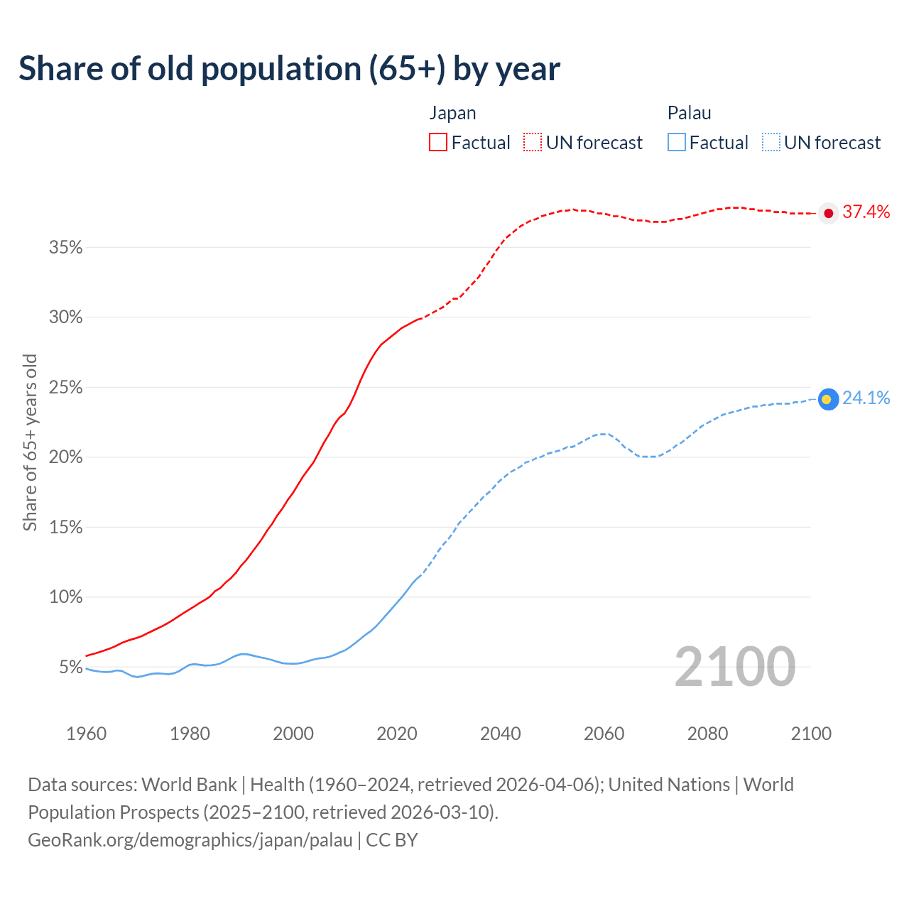 The share of older people aged 65 and over is 29.8% in Japan and 11.3% in Palau. Life expectancy in Japan compared to Palau .