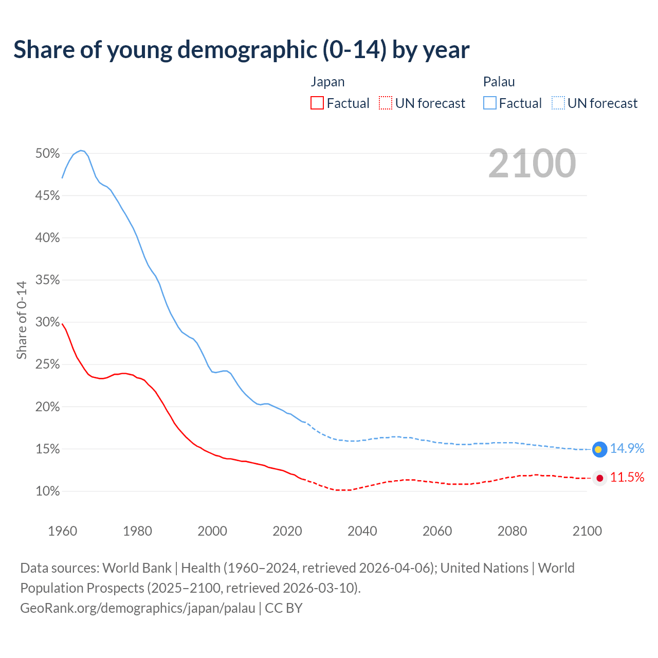 - The share of young demographic (0-15 years old) in Japan is 11.4% vs 18.2% in Palau.