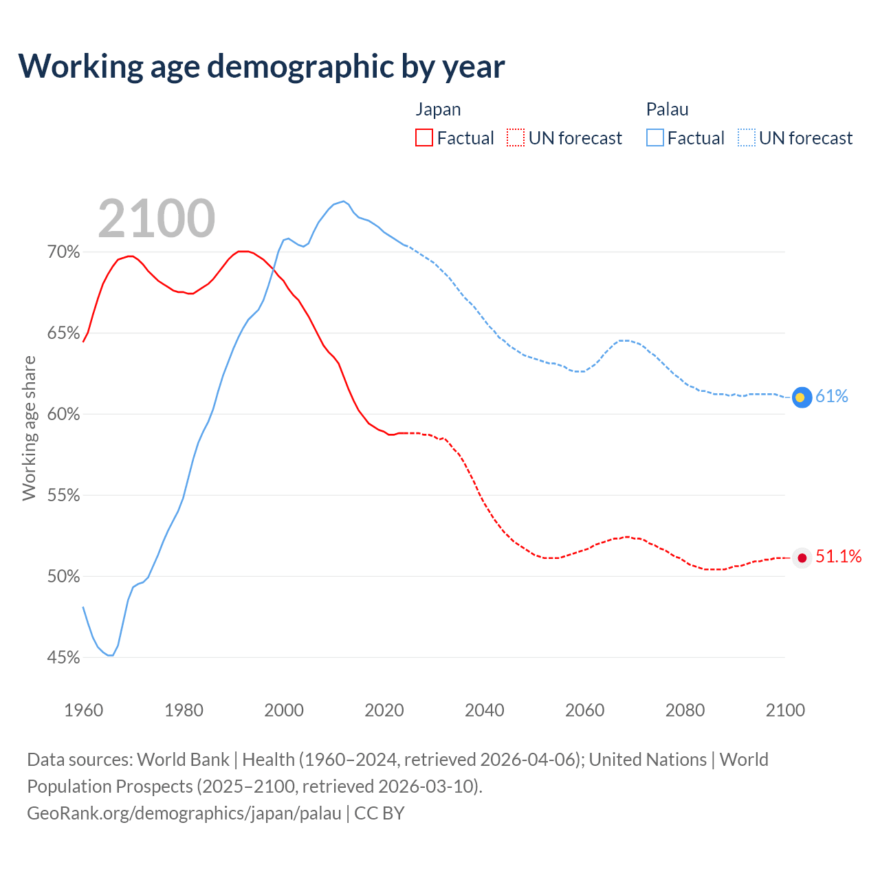 - Japan has 72.1M working age adults (aged 15-64) vs 12.4K in Palau.