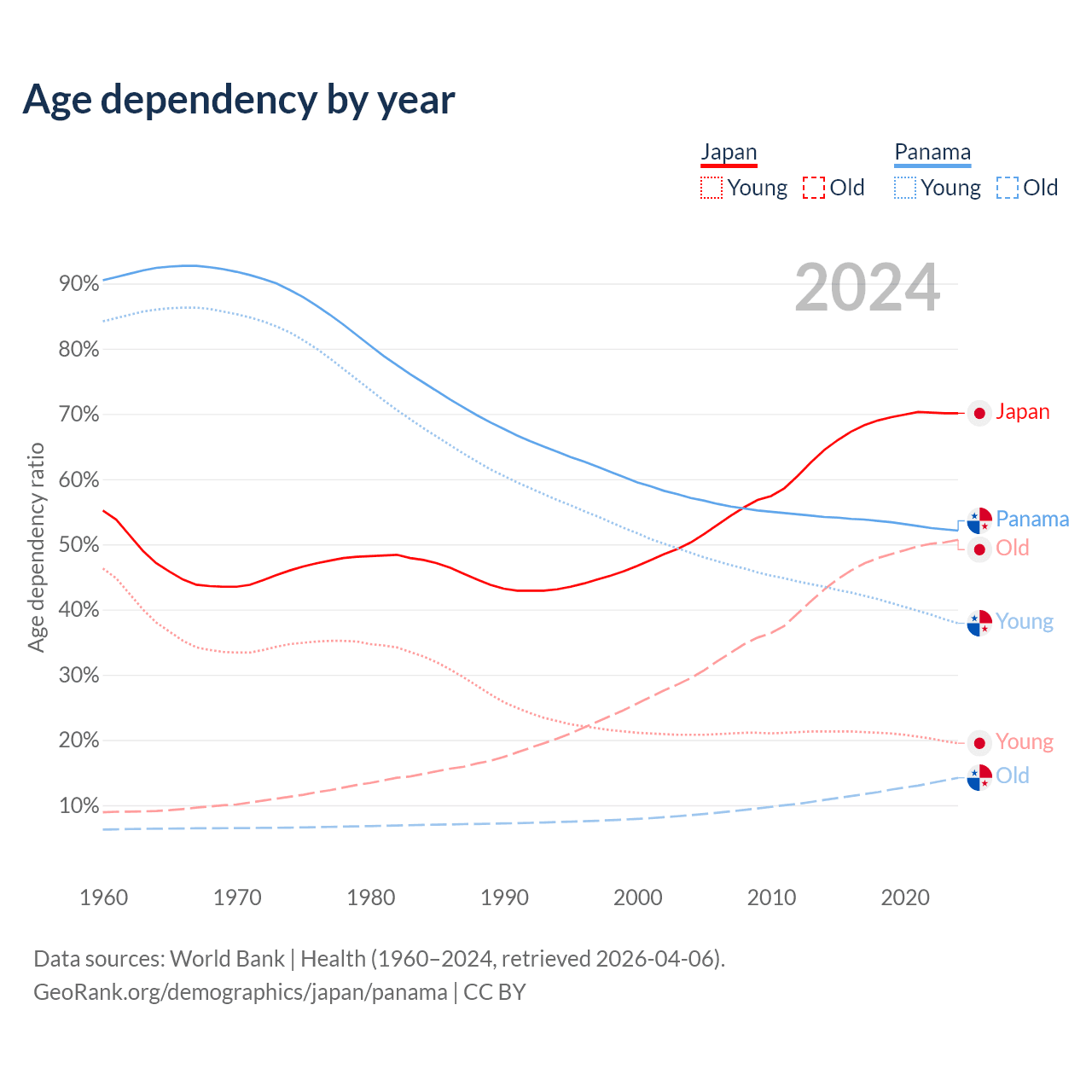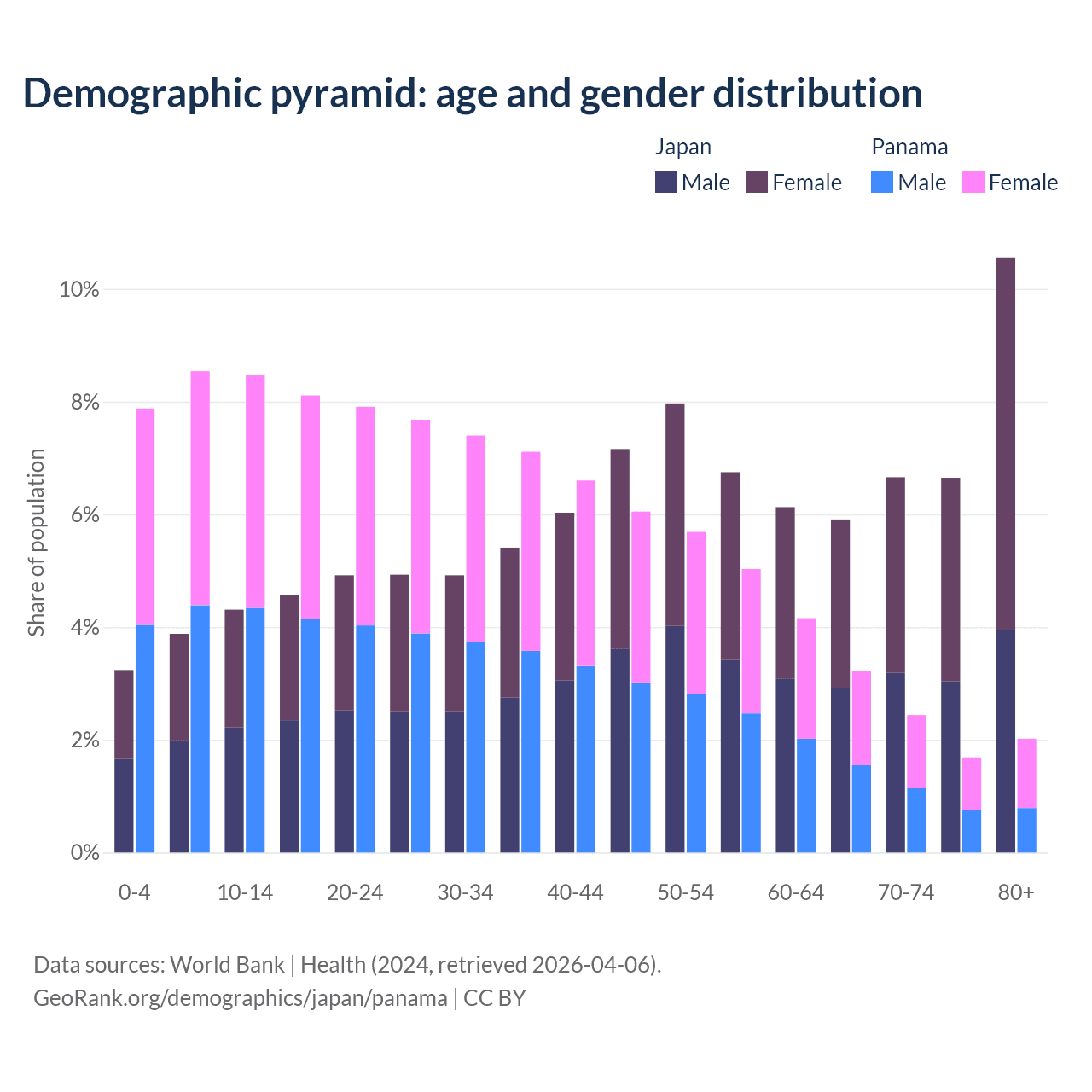 - Japan is ranked 2/196 by median age (oldest to youngest) vs 94/196 for Panama.