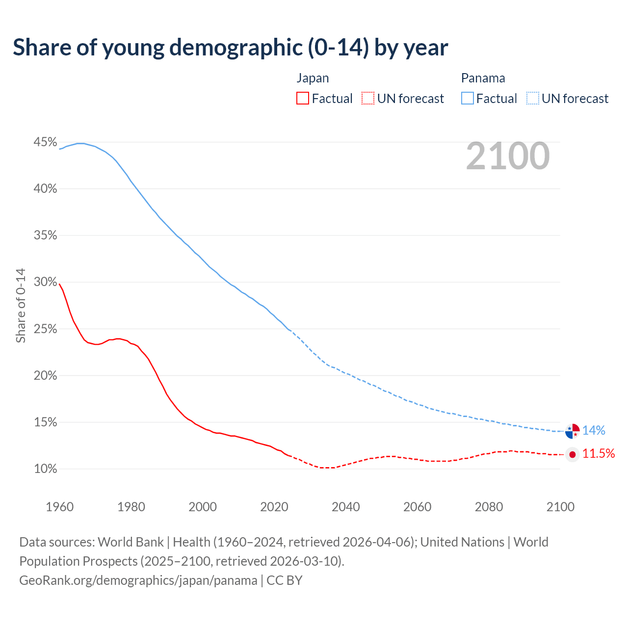 - The share of young demographic (0-15 years old) in Japan is 11.4% vs 24.9% in Panama.