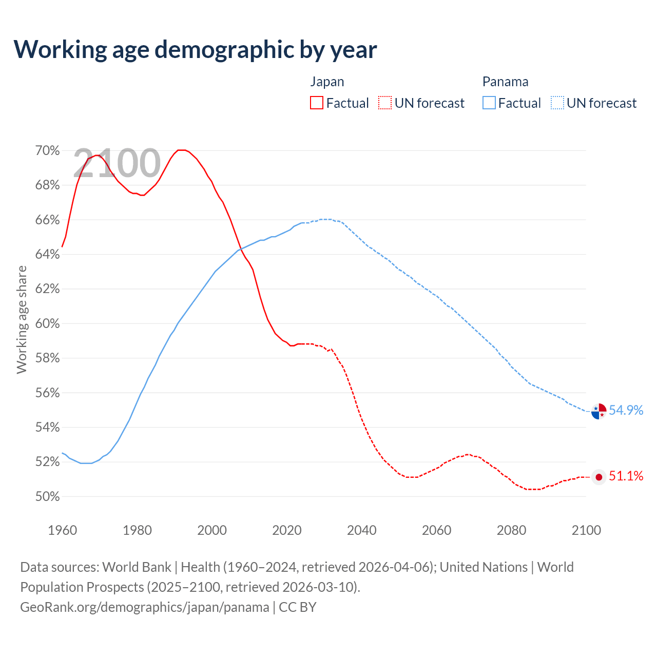 - Japan has 72.1M working age adults (aged 15-64) vs 3.05M in Panama.