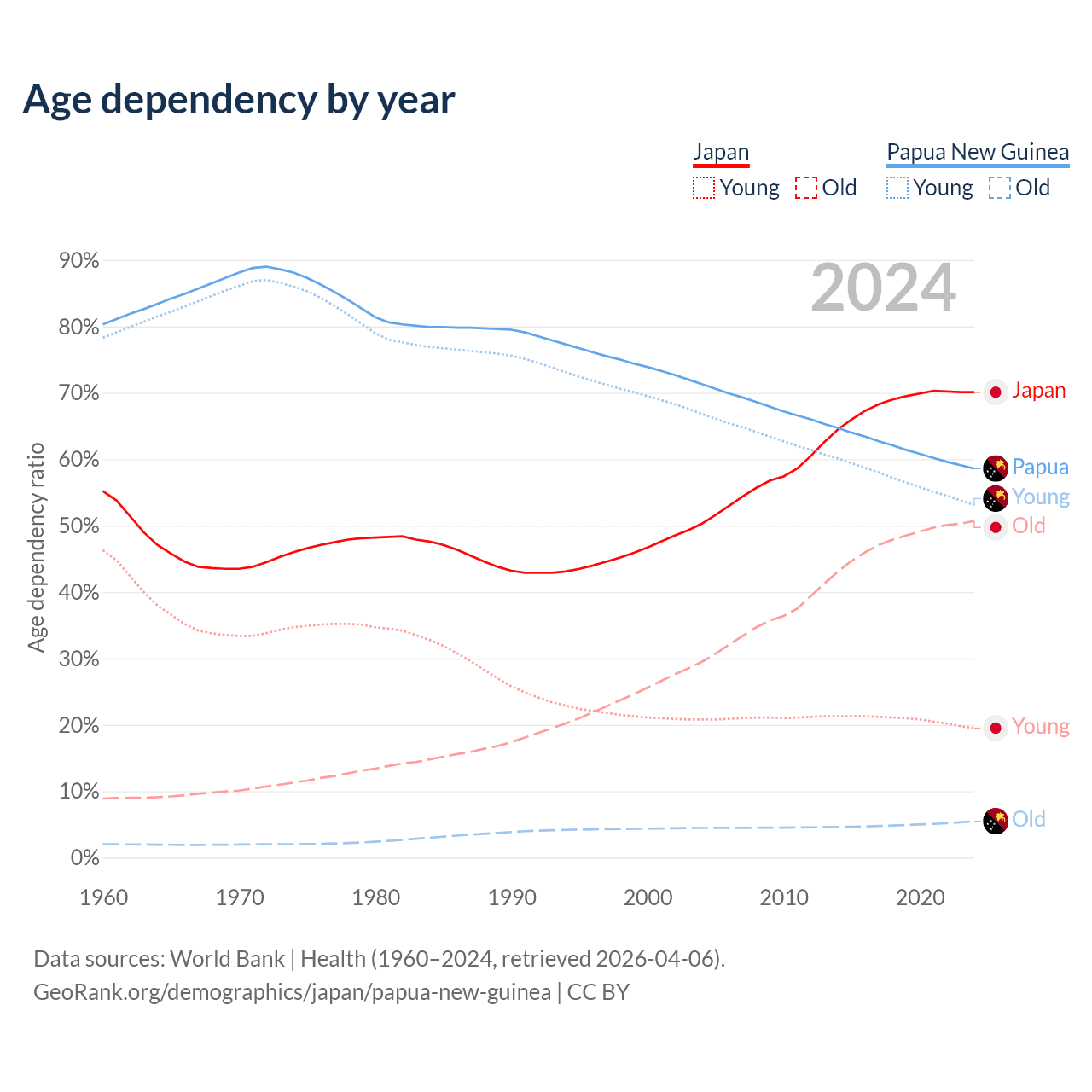 - Japan is ranked 2/196 by median age (oldest to youngest) vs 140/196 for Papua New Guinea.