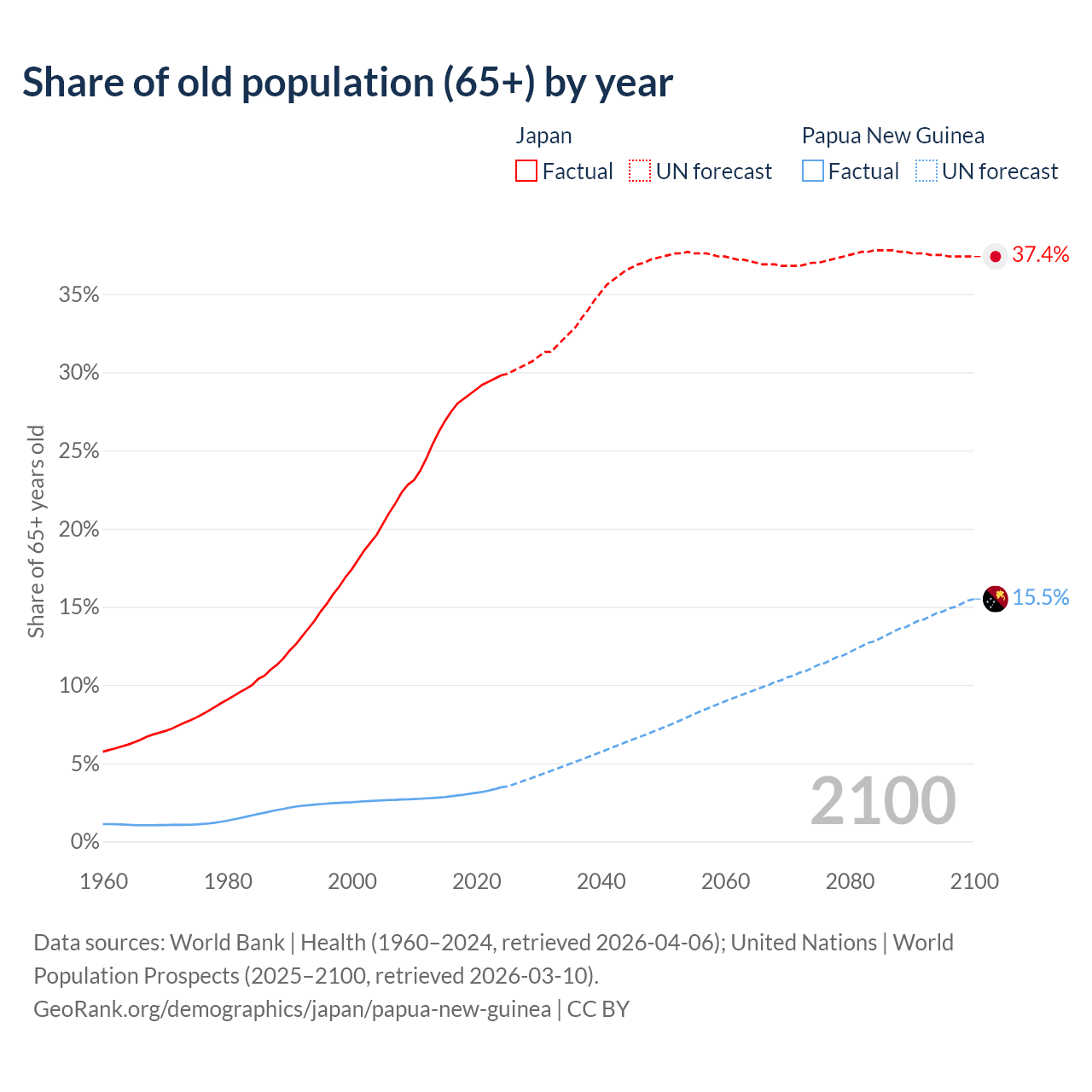 The share of older people aged 65 and over is 29.8% in Japan and 3.46% in Papua New Guinea. Life expectancy in Japan compared to Papua New Guinea .