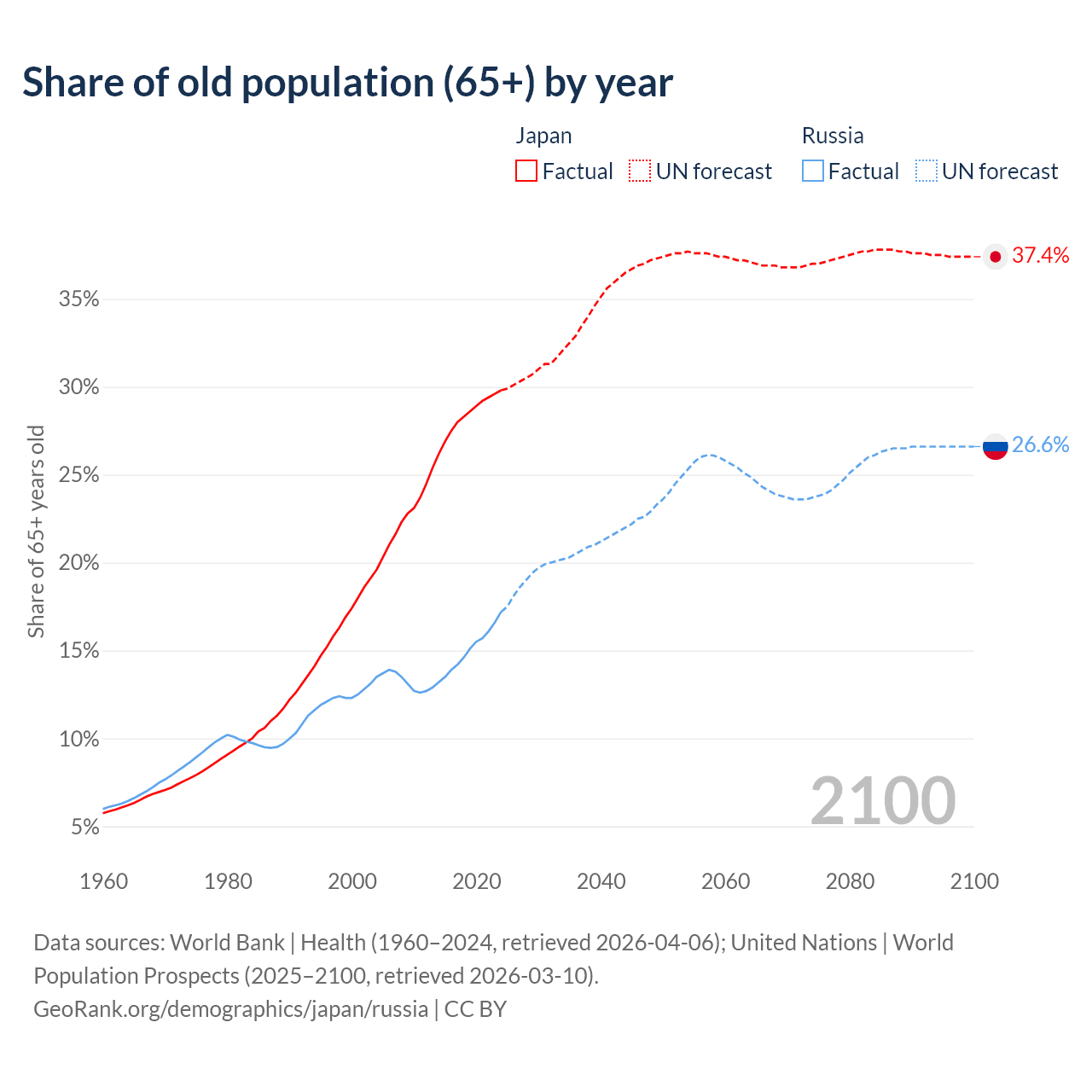 The share of older people aged 65 and over is 29.8% in Japan and 17.2% in Russia. Life expectancy in Japan compared to Russia .