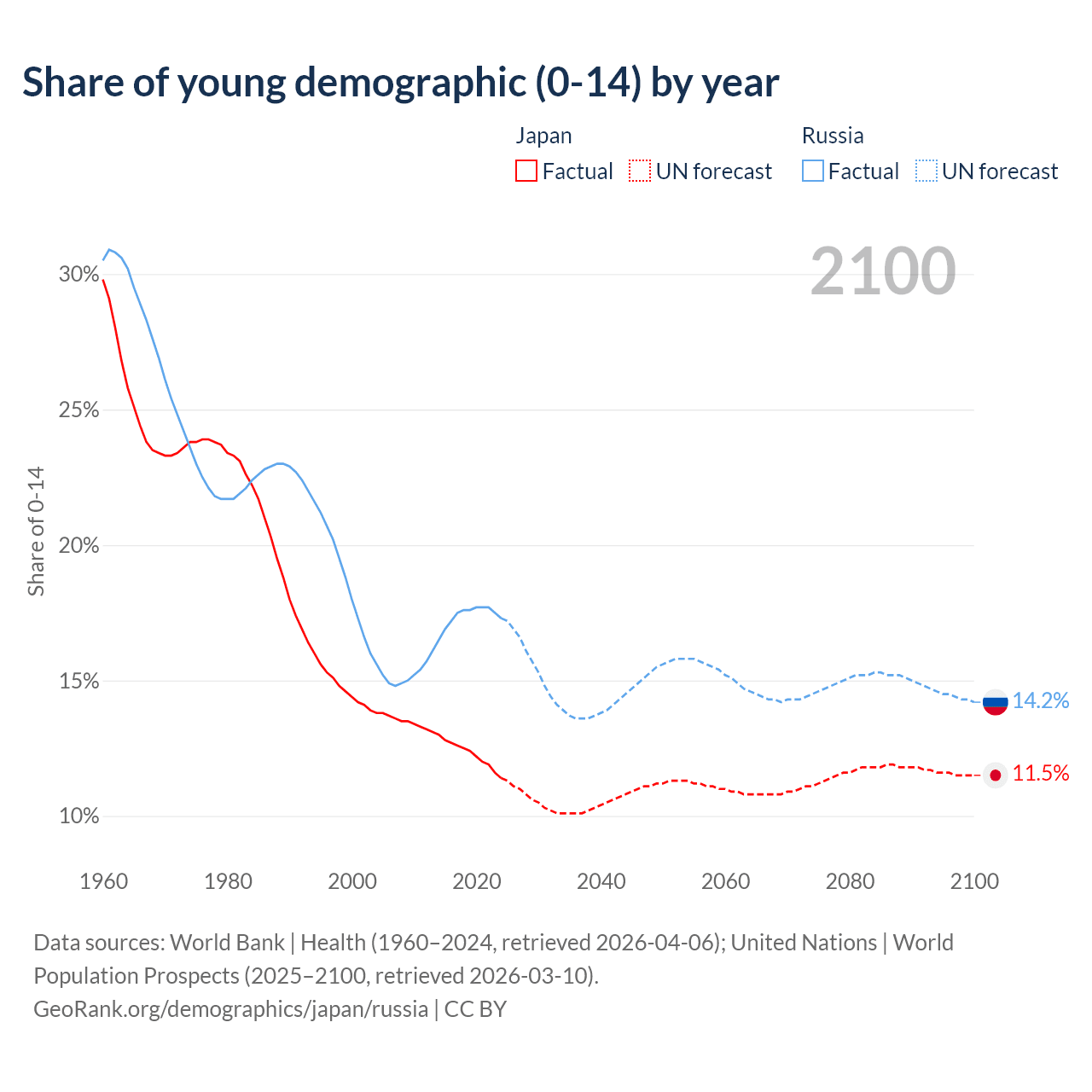 - The share of young demographic (0-15 years old) in Japan is 11.4% vs 17.3% in Russia.