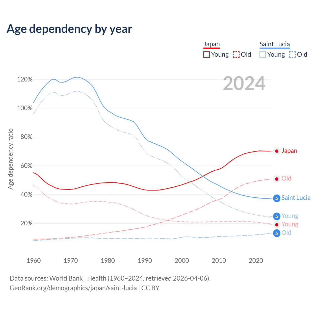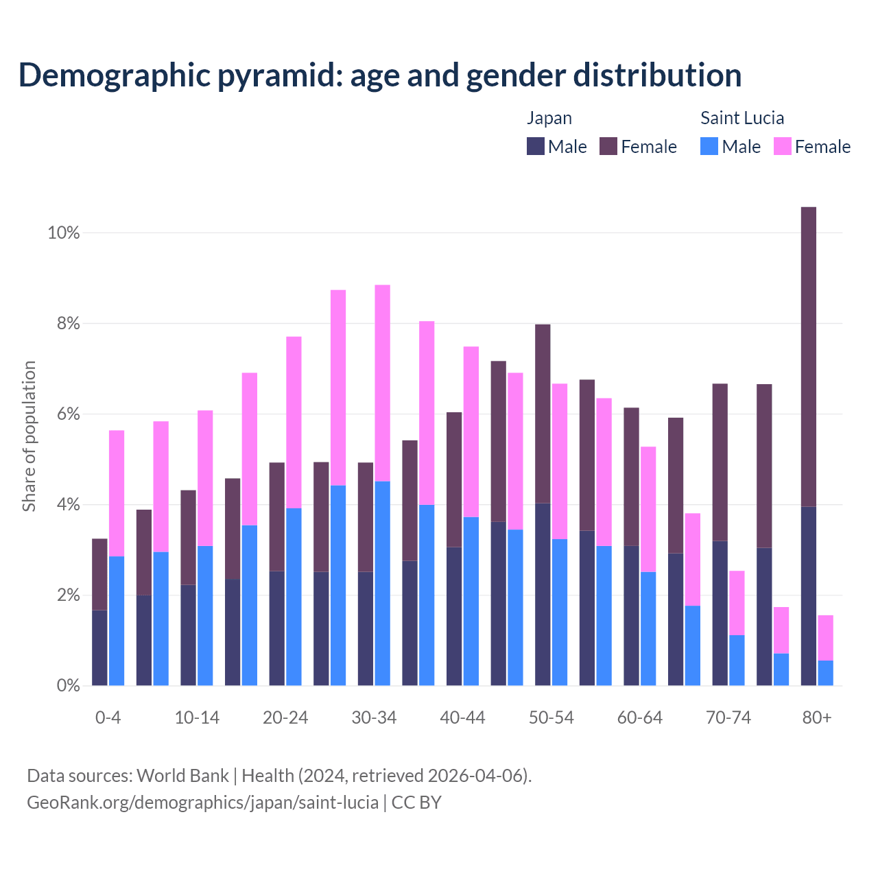- Japan is ranked 2/196 by median age (oldest to youngest) vs 74/196 for Saint Lucia.