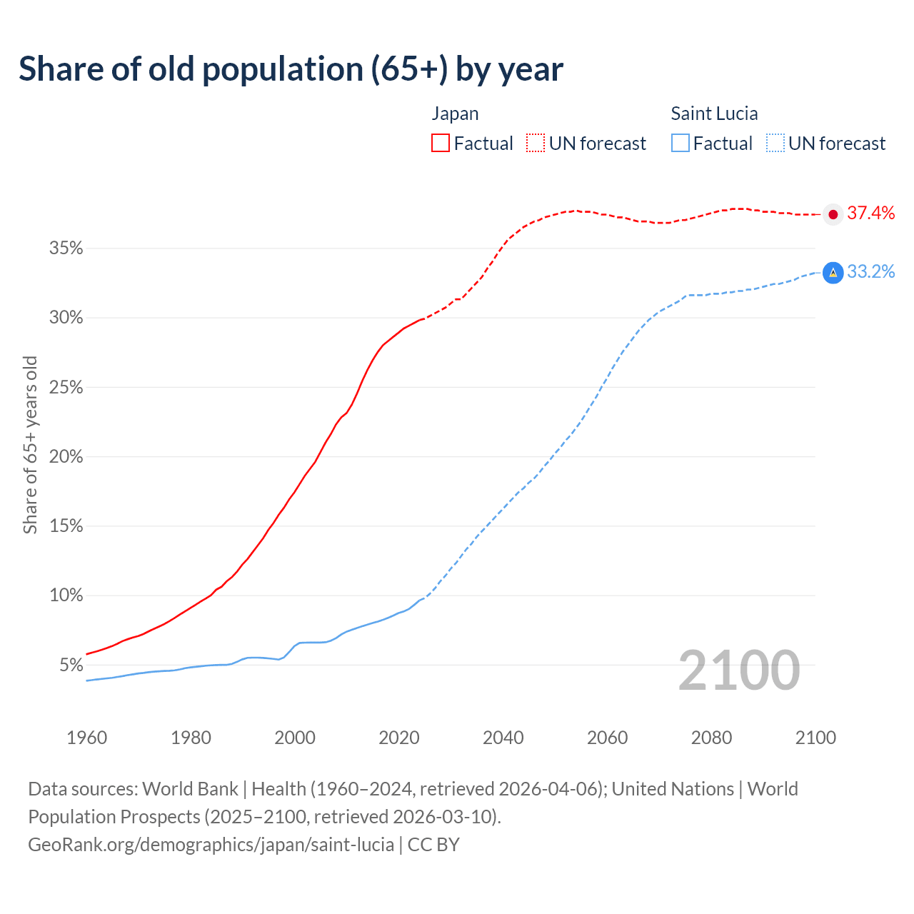 The share of older people aged 65 and over is 29.8% in Japan and 9.62% in Saint Lucia. Life expectancy in Japan compared to Saint Lucia .