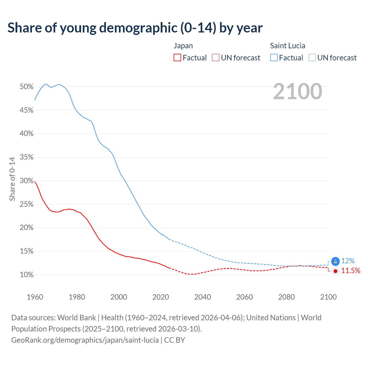 - The share of young demographic (0-15 years old) in Japan is 11.4% vs 17.5% in Saint Lucia.