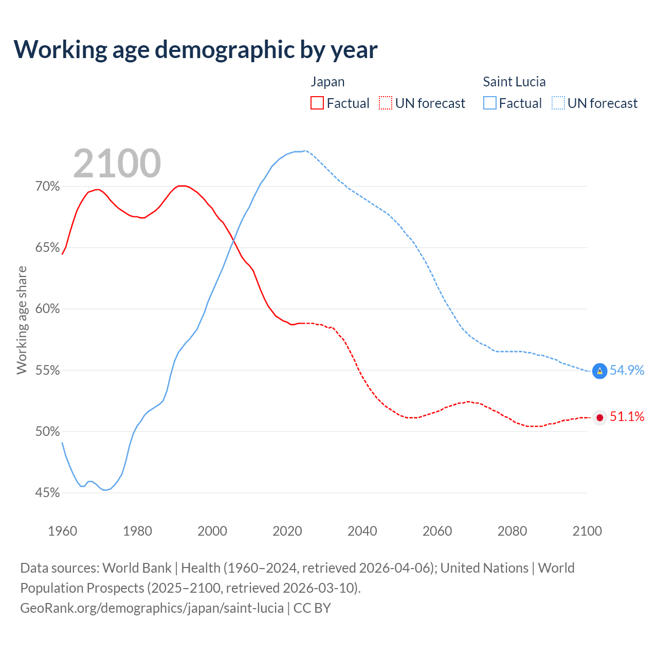 - Japan has 72.1M working age adults (aged 15-64) vs 132K in Saint Lucia.