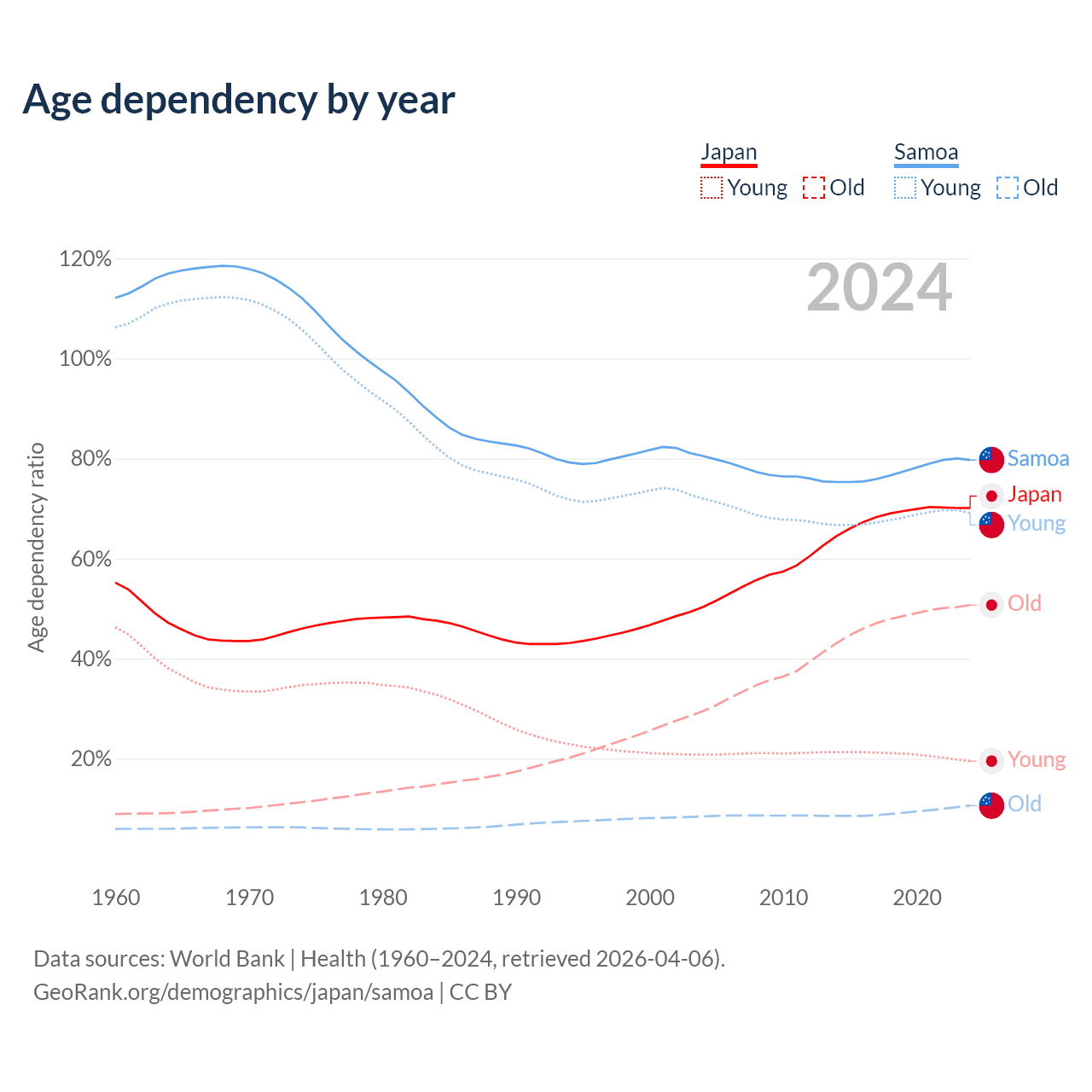 - The share of old-age demographic (65+) in Japan is 29.8% vs 5.88% in Samoa.
