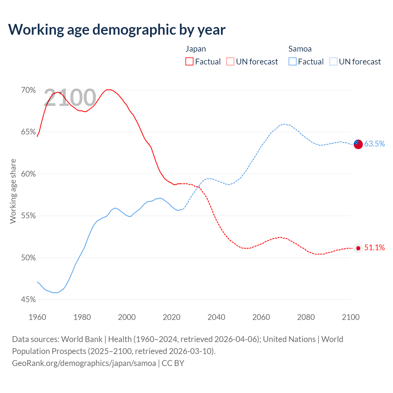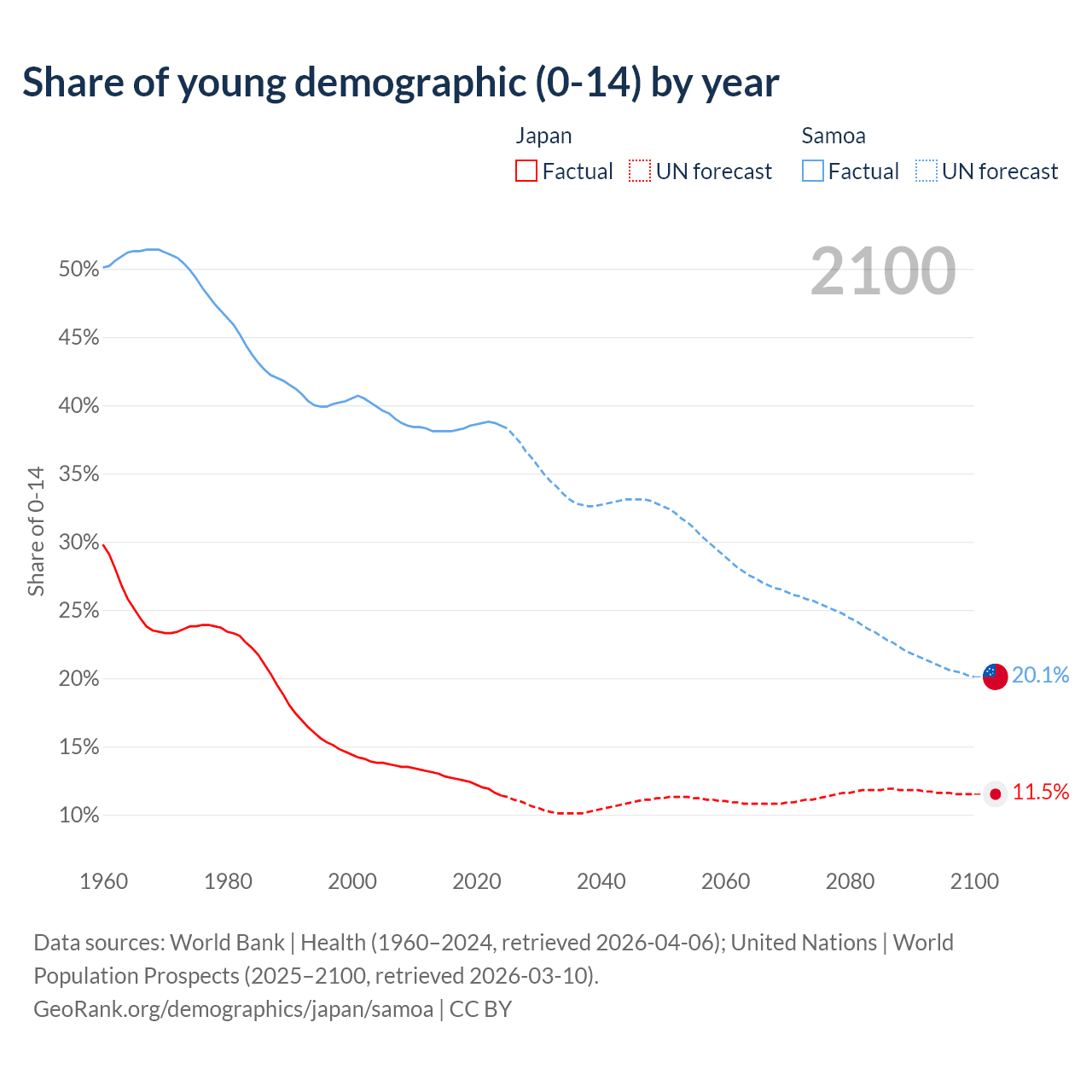 Median age Japan vs Samoa, 1960-2100