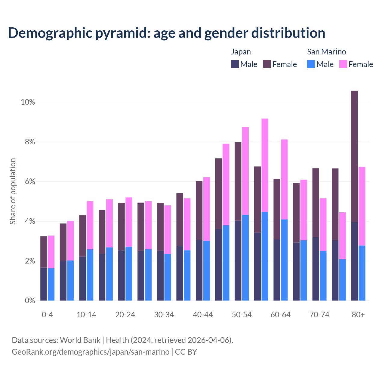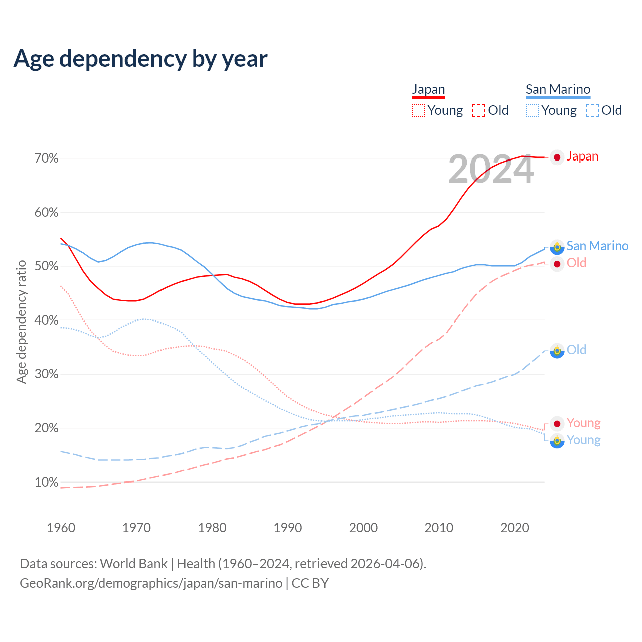 - Japan is ranked 2/196 by median age (oldest to youngest) vs 3/196 for San Marino.