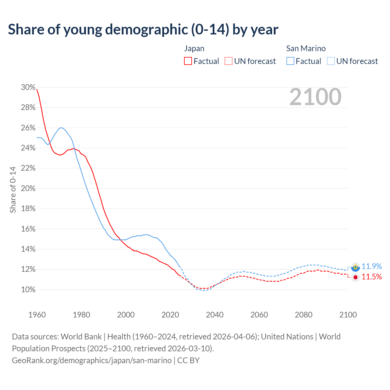 - The share of young demographic (0-15 years old) in Japan is 11.4% vs 12.3% in San Marino.