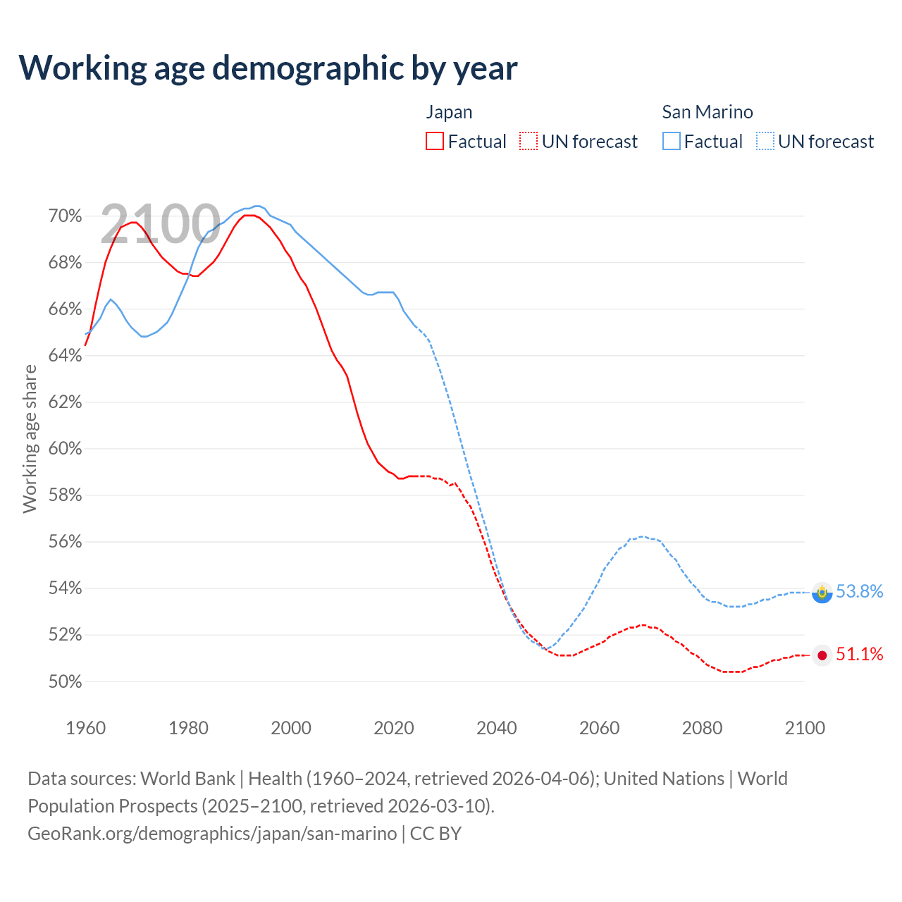 - Japan has 72.1M working age adults (aged 15-64) vs 22.2K in San Marino.