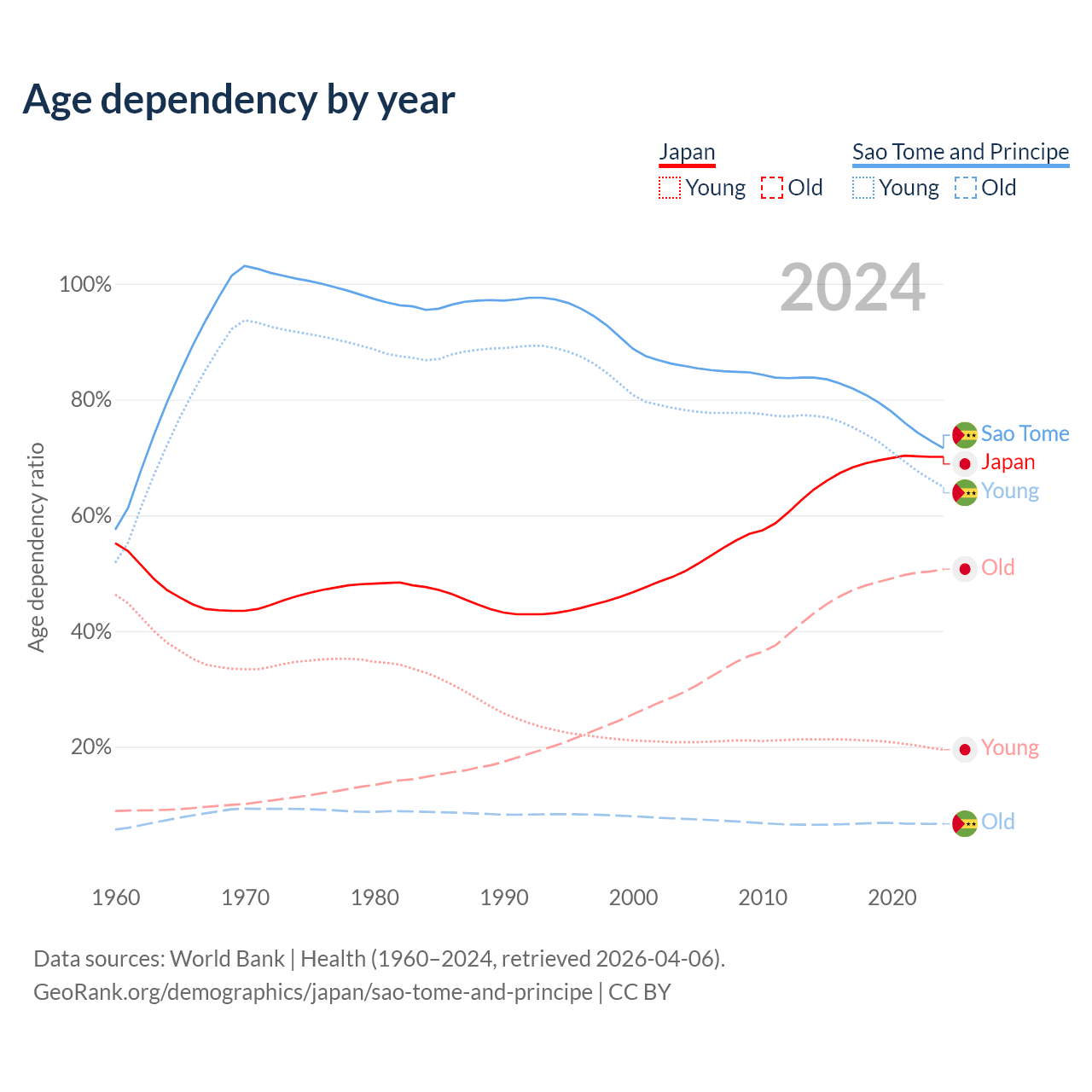 - Japan is ranked 2/196 by median age (oldest to youngest) vs 163/196 for Sao Tome and Principe.