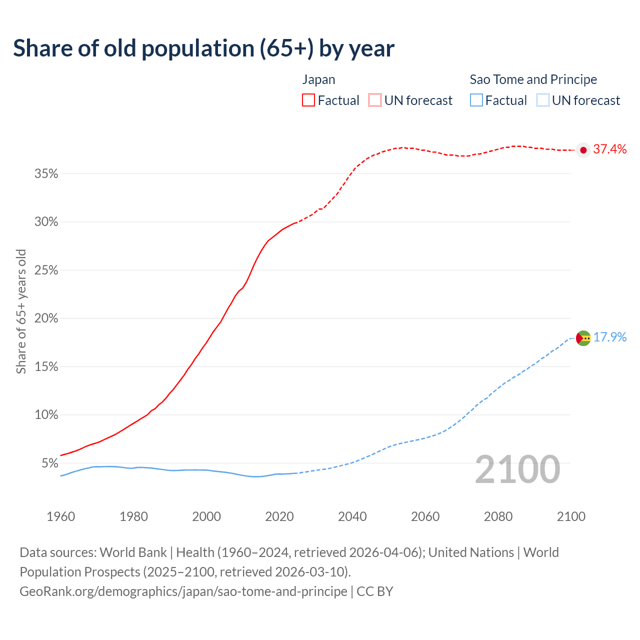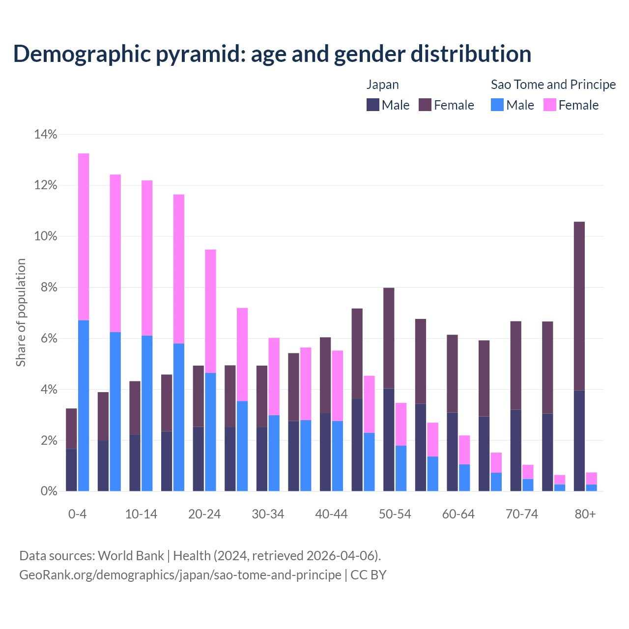 The share of older people aged 65 and over is 29.8% in Japan and 3.9% in Sao Tome and Principe. Life expectancy in Japan compared to Sao Tome and Principe .