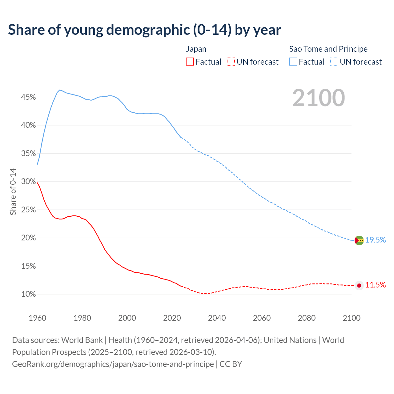 - The share of young demographic (0-15 years old) in Japan is 11.4% vs 37.8% in Sao Tome and Principe.