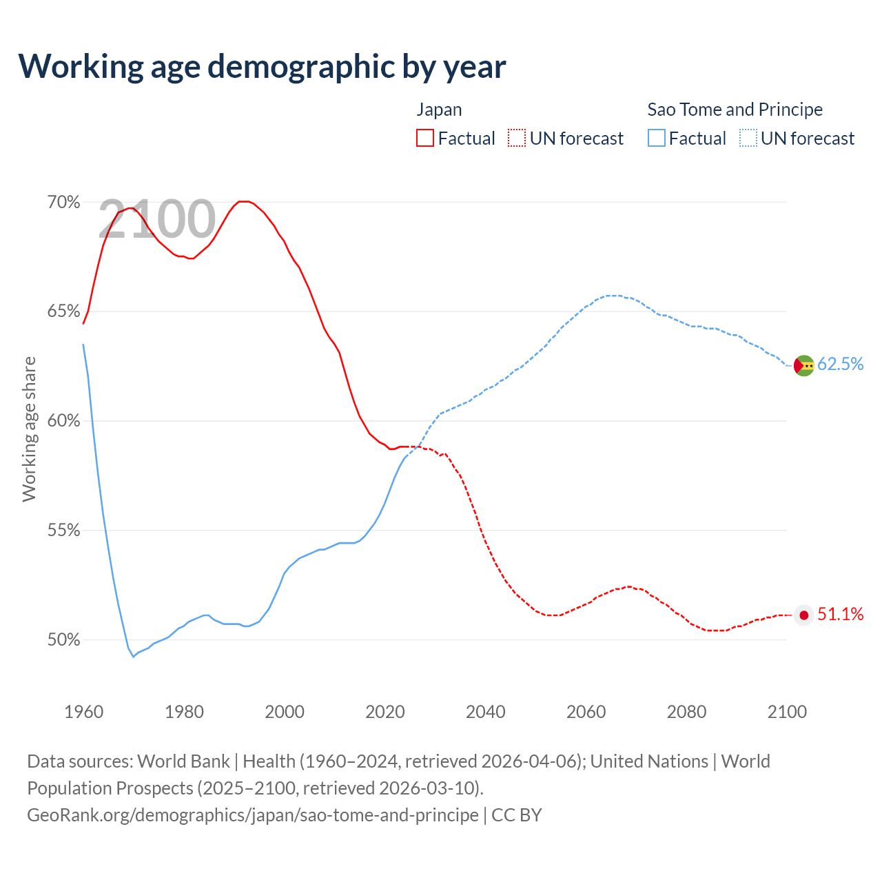 Median age Japan vs Sao Tome and Principe, 1960-2100