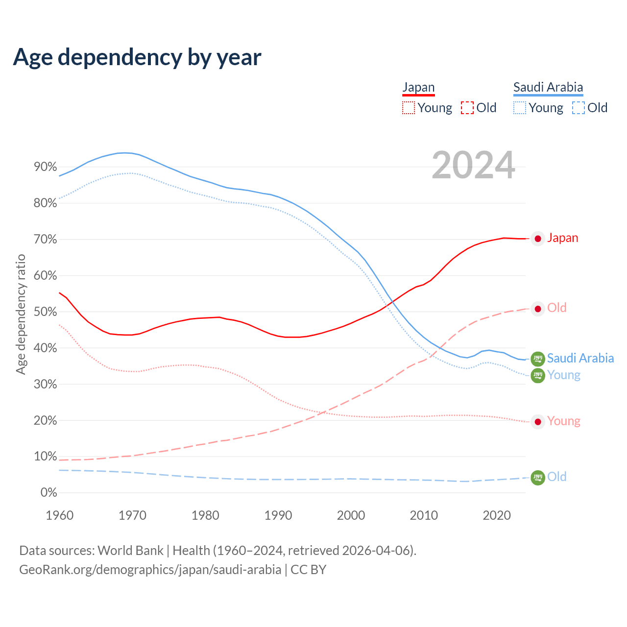 - Japan is ranked 2/196 by median age (oldest to youngest) vs 98/196 for Saudi Arabia.