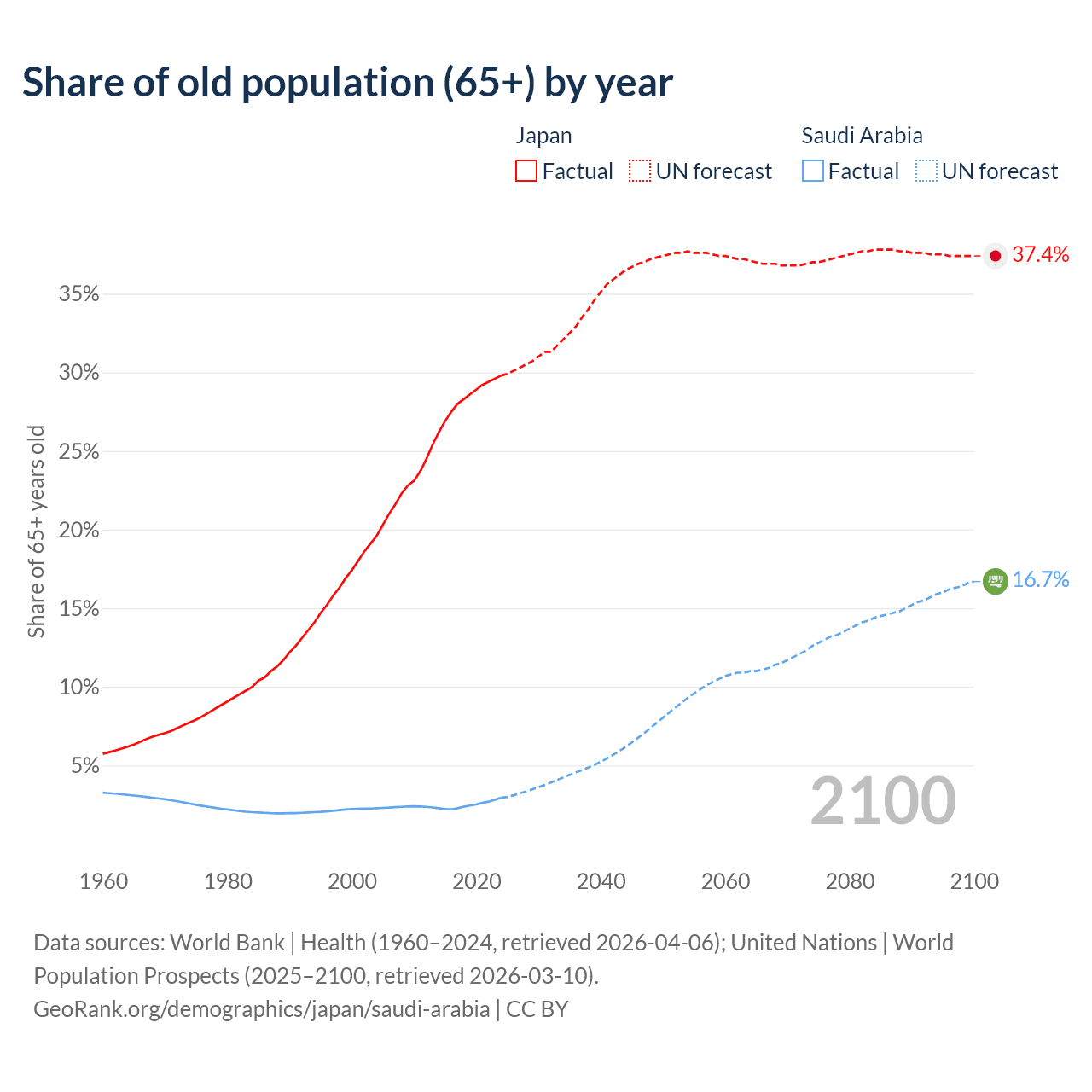 The share of older people aged 65 and over is 29.8% in Japan and 2.95% in Saudi Arabia. Life expectancy in Japan compared to Saudi Arabia .