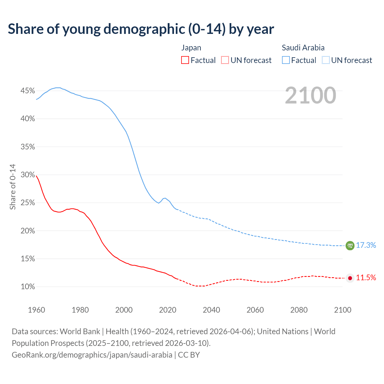 - The share of young demographic (0-15 years old) in Japan is 11.4% vs 23.8% in Saudi Arabia.