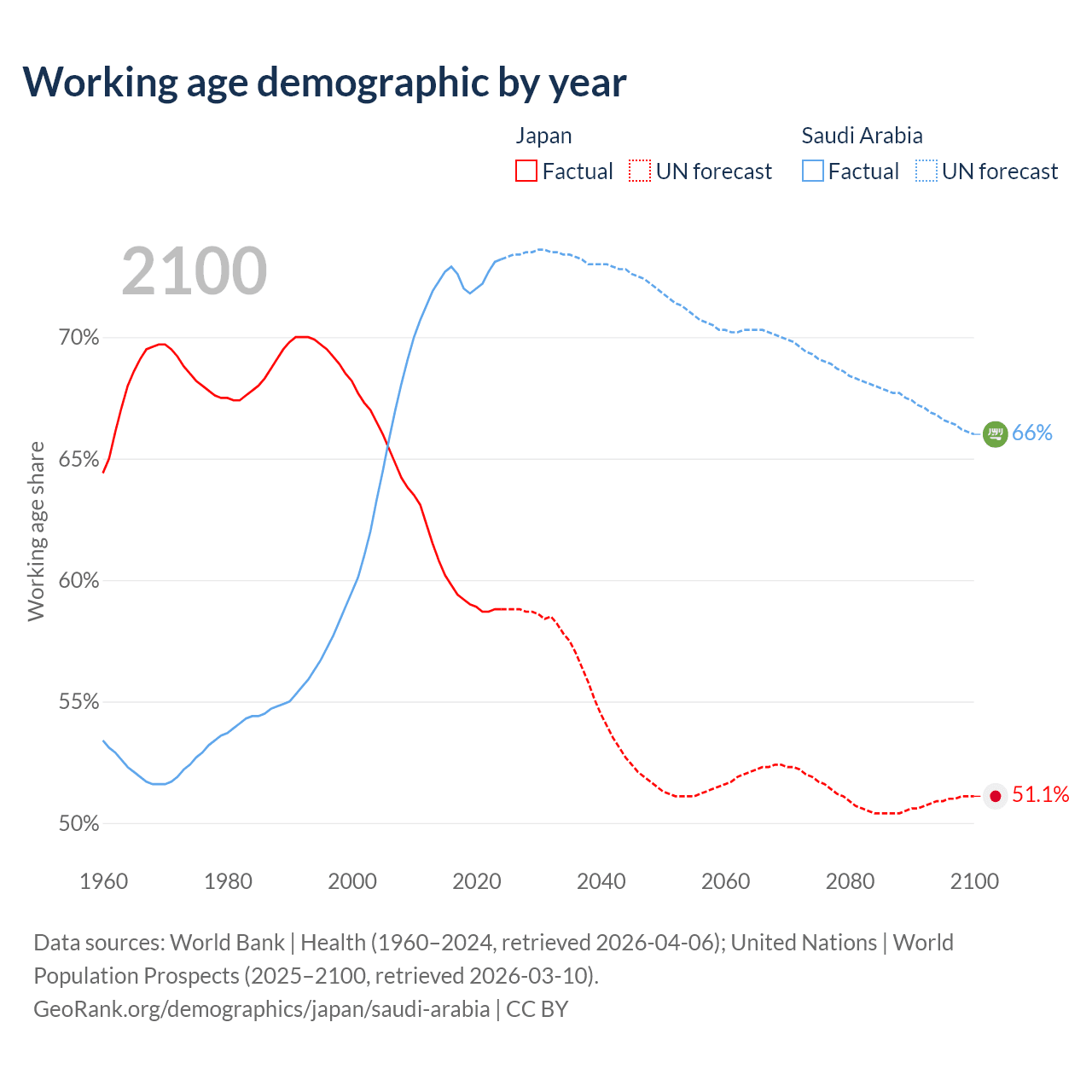 - Japan has 72.1M working age adults (aged 15-64) vs 26.9M in Saudi Arabia.
