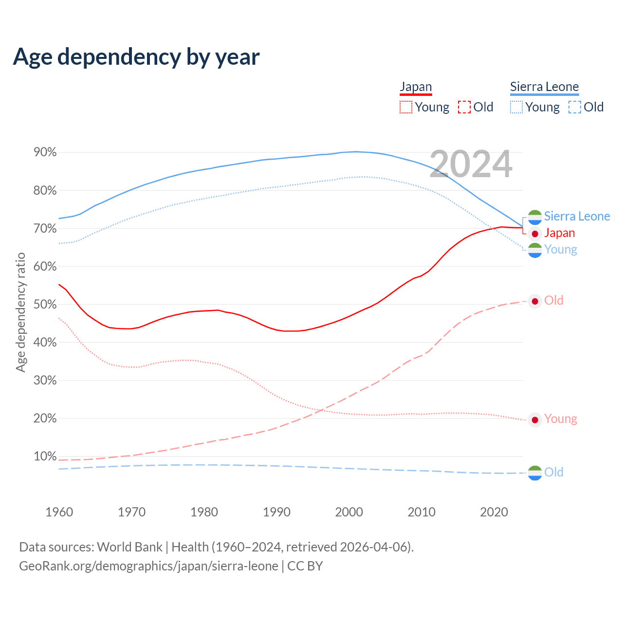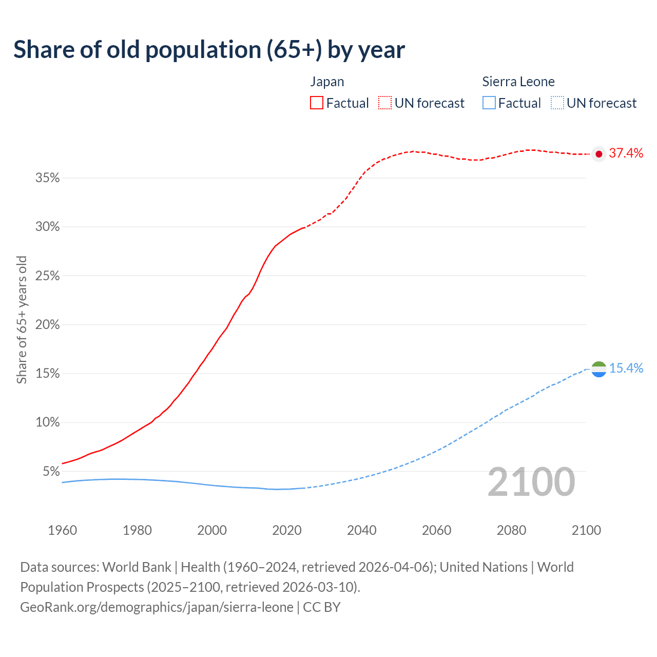 The share of older people aged 65 and over is 29.8% in Japan and 3.24% in Sierra Leone. Life expectancy in Japan compared to Sierra Leone .