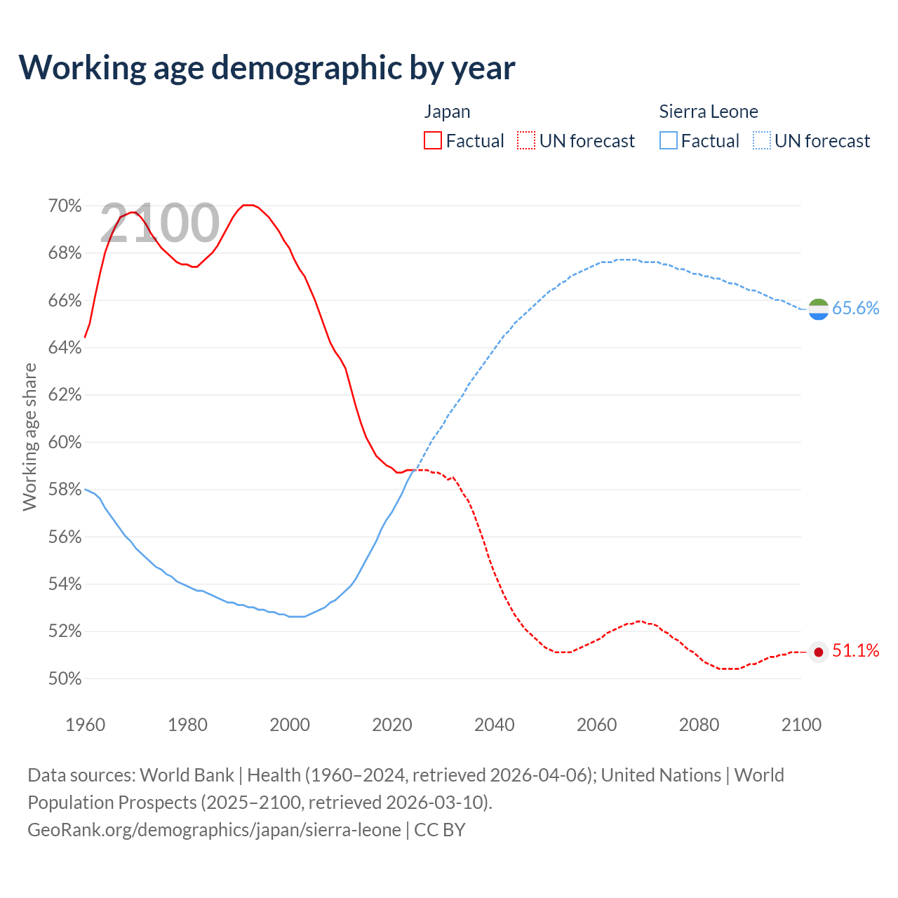 Median age Japan vs Sierra Leone, 1960-2100