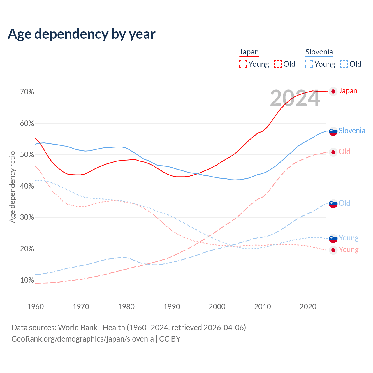 - Japan is ranked 2/196 by median age (oldest to youngest) vs 14/196 for Slovenia.