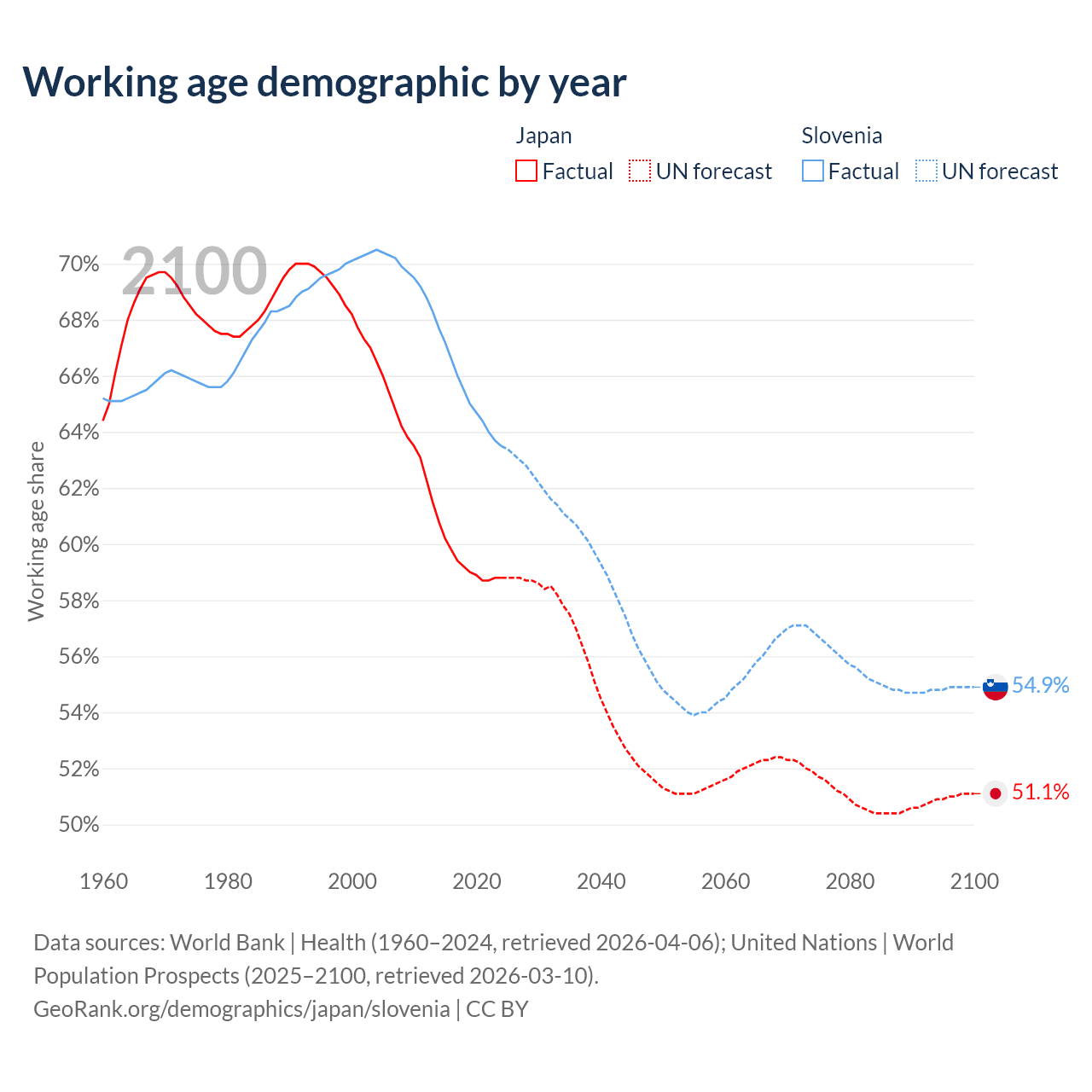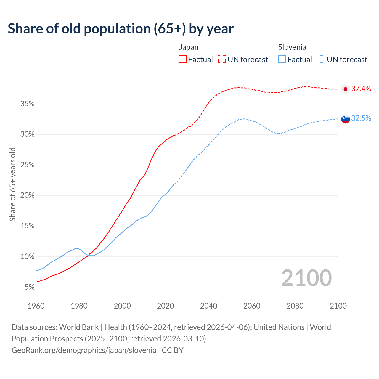 The share of older people aged 65 and over is 29.8% in Japan and 21.8% in Slovenia. Life expectancy in Japan compared to Slovenia .