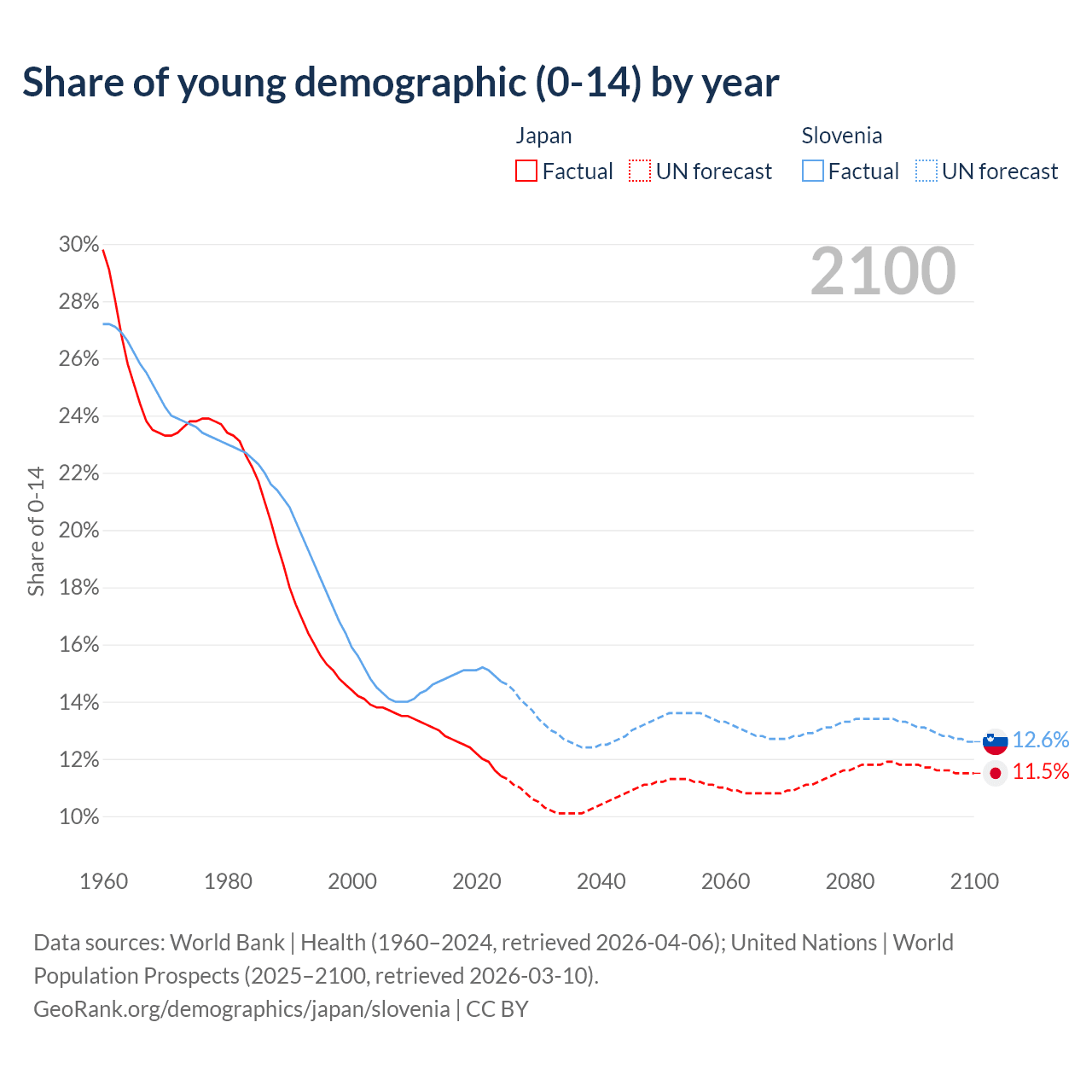 - The share of young demographic (0-15 years old) in Japan is 11.4% vs 14.7% in Slovenia.