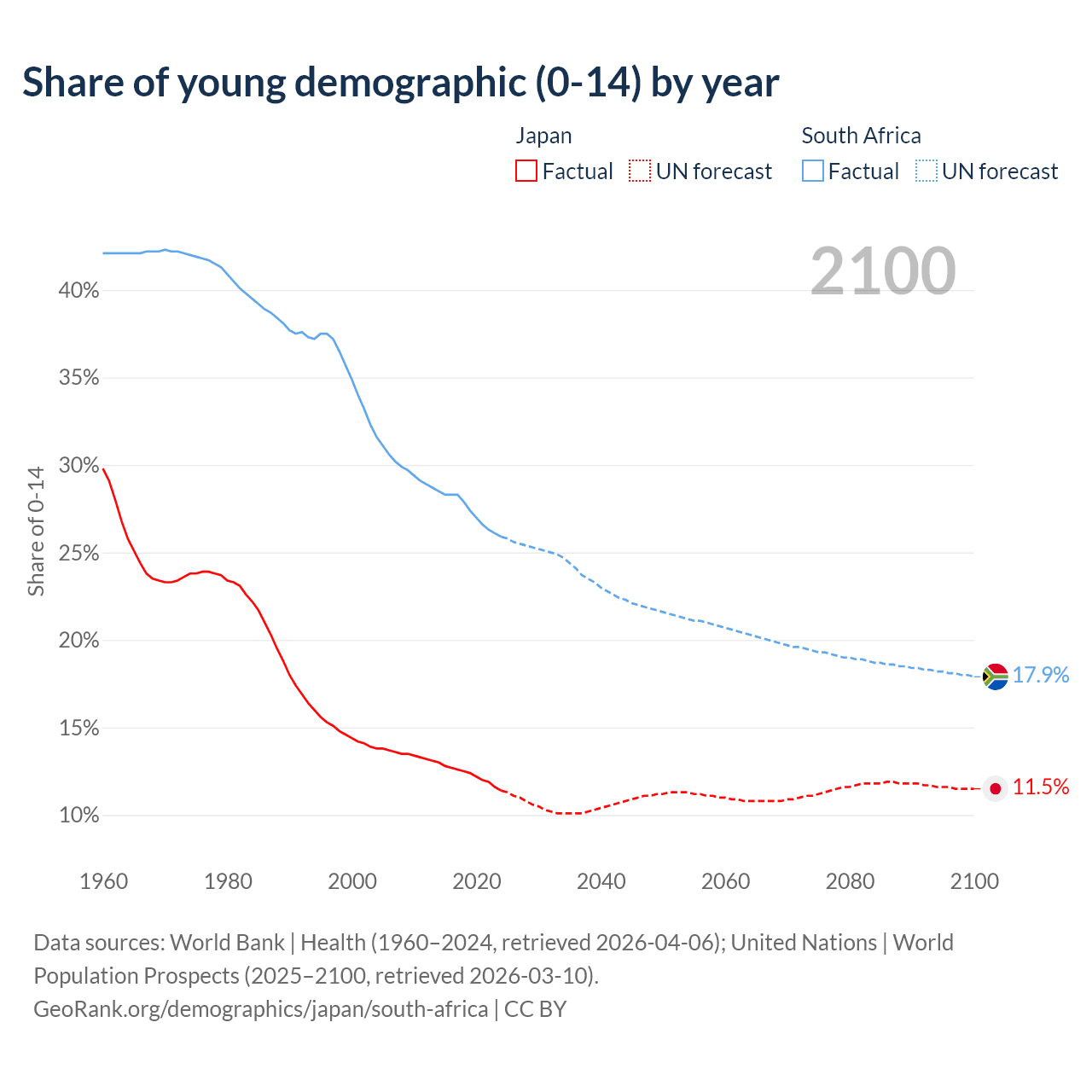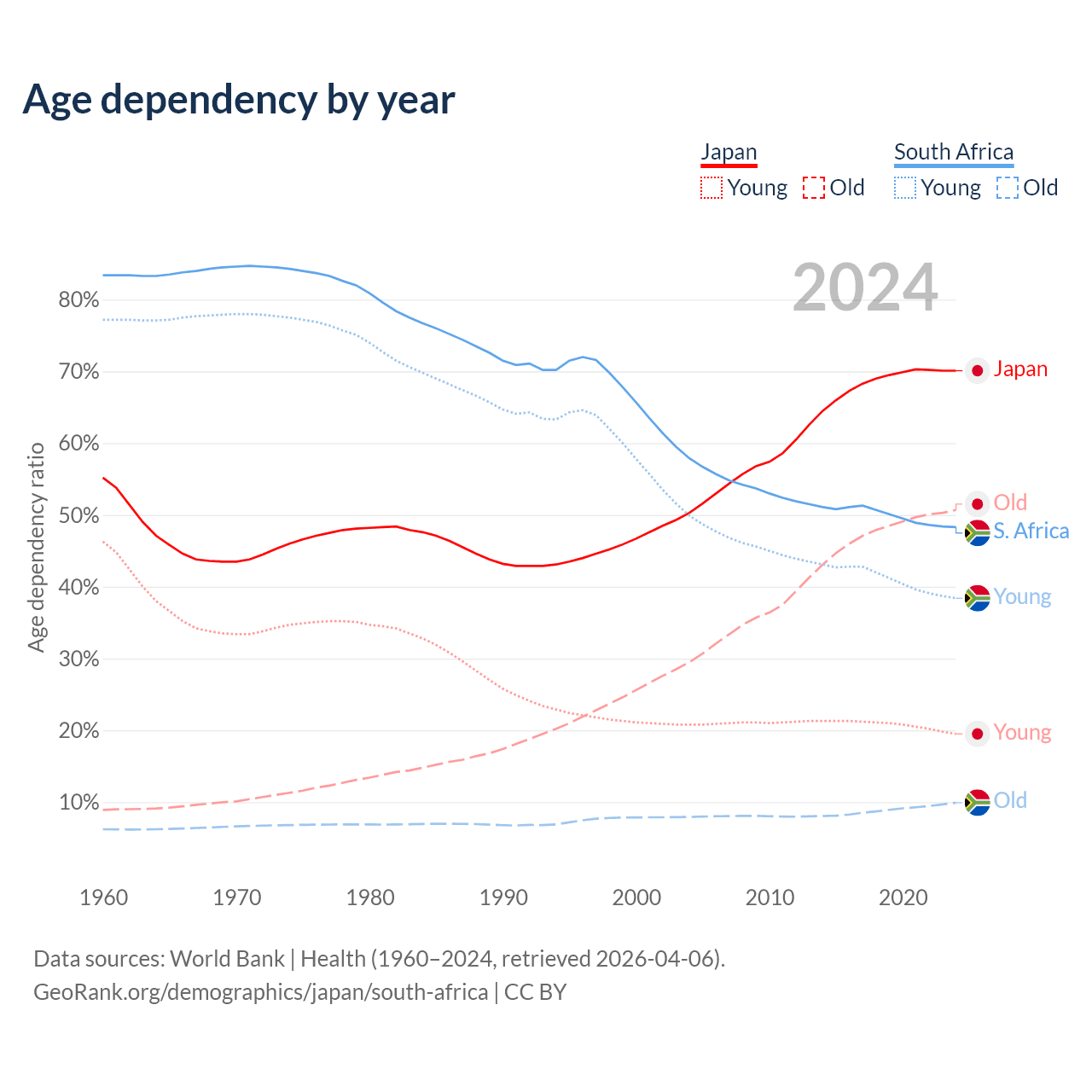 - Japan is ranked 2/196 by median age (oldest to youngest) vs 107/196 for South Africa.