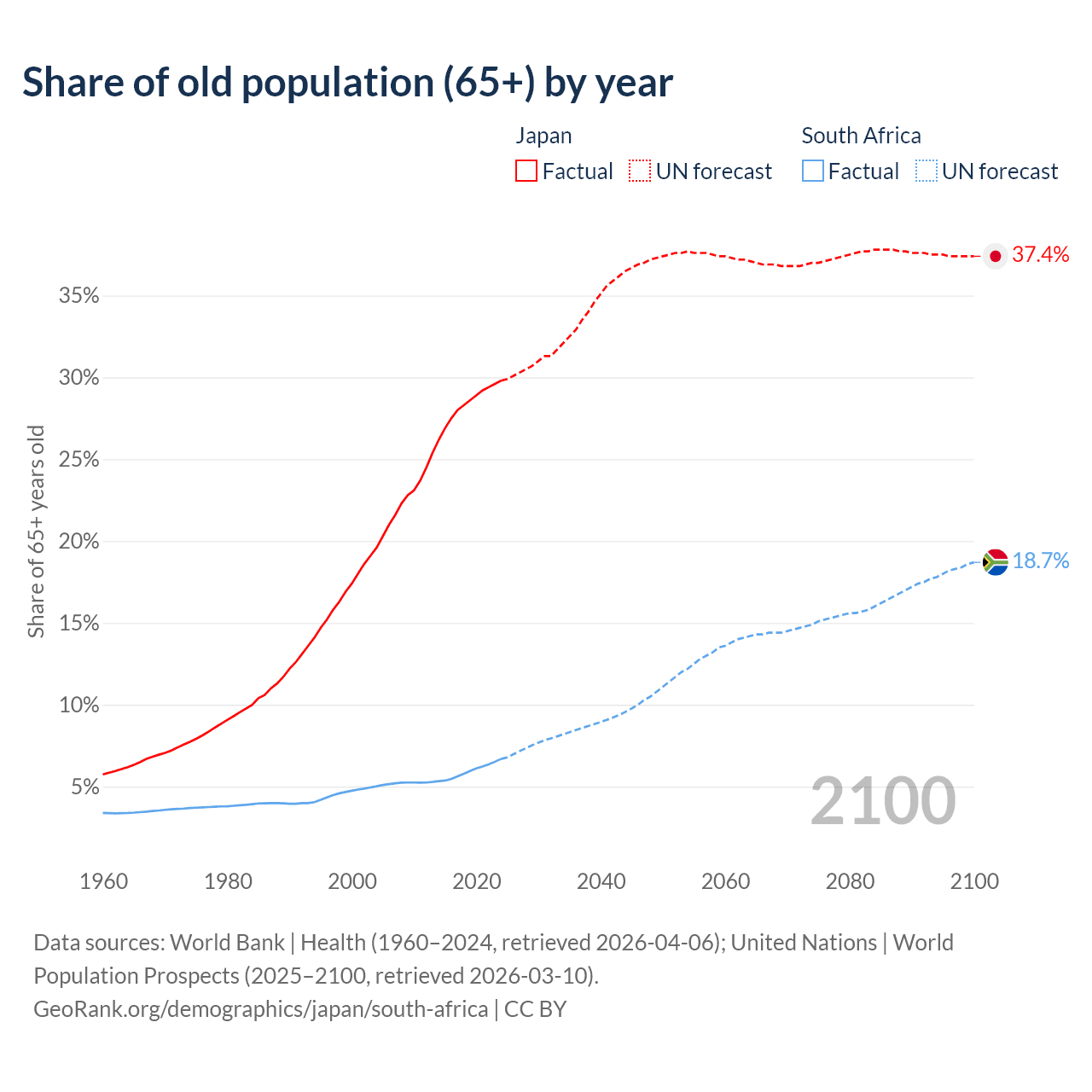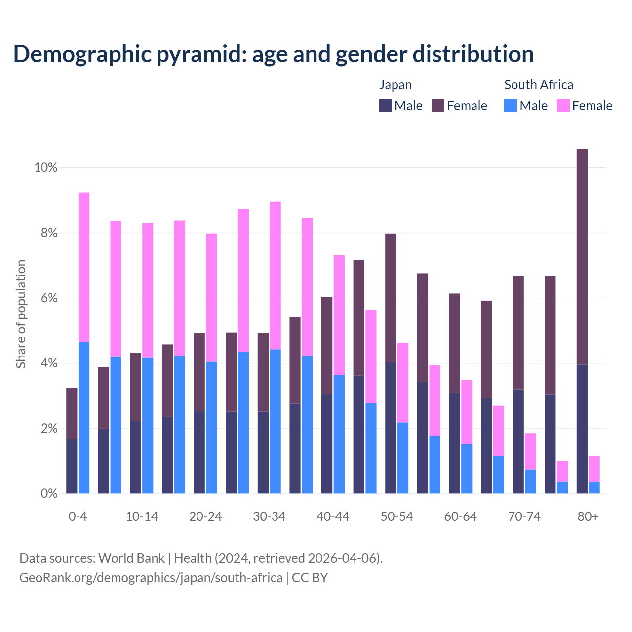 The share of older people aged 65 and over is 29.8% in Japan and 6.69% in South Africa. Life expectancy in Japan compared to South Africa .